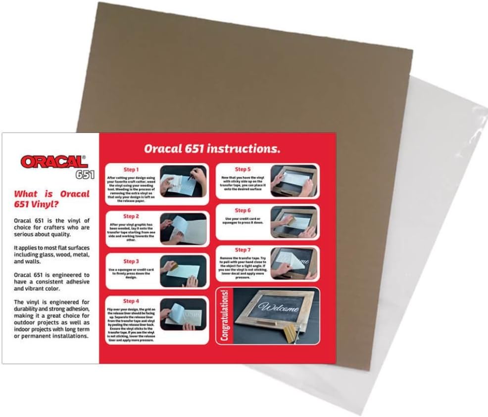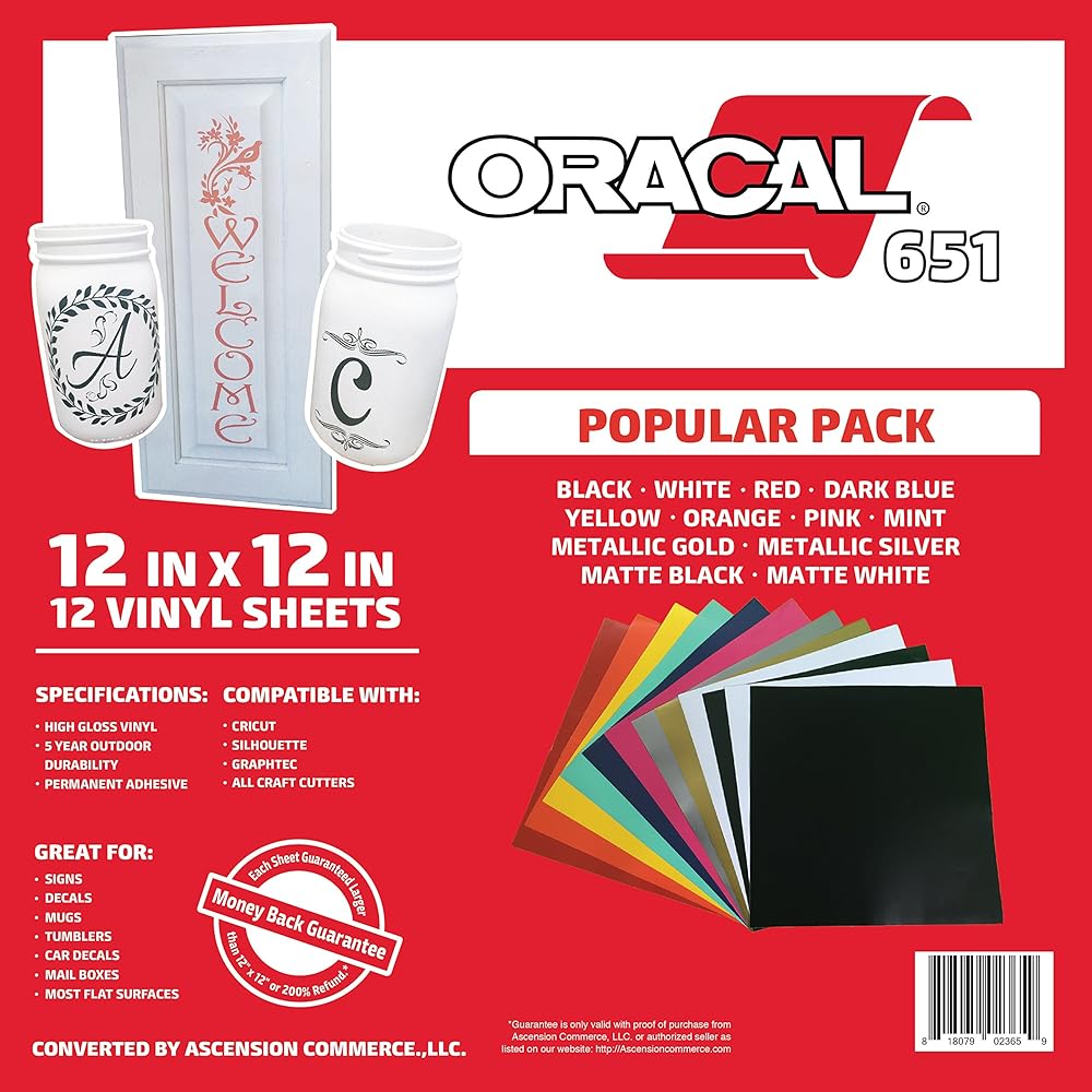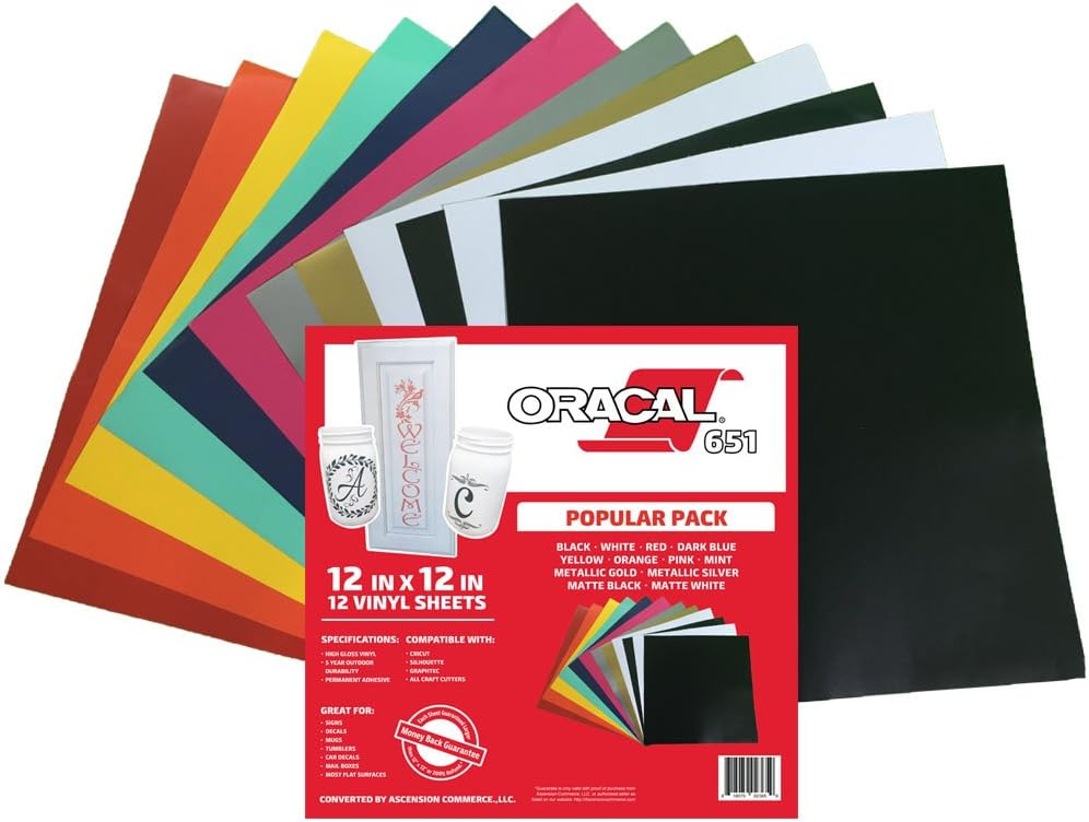 Oracal 651 vinyl is perfect for your crafting needs. Oracal film is compatible with all craft cutters, including the Cricut, Silhouette, Xyron, Craft ROBO, Graphtec, and more. It is a intermediate calendared vinyl, measuring at 2.5 mils in thickness. Manufactured in the United States, this is a high quality vinyl with consistent results. Easy to weed and durable, Oracal 651 is ideal for use on tumblers, window decals, car decals, signs, stencils, scrapbooking, or any other permanent application with a semi-smooth surface. The repositionable, pressure-sensitive adhesive means the media can be moved during a dry application and lightly repositioned it until it's just right. This vinyl has a gloss finish that truly stands out from the competition.