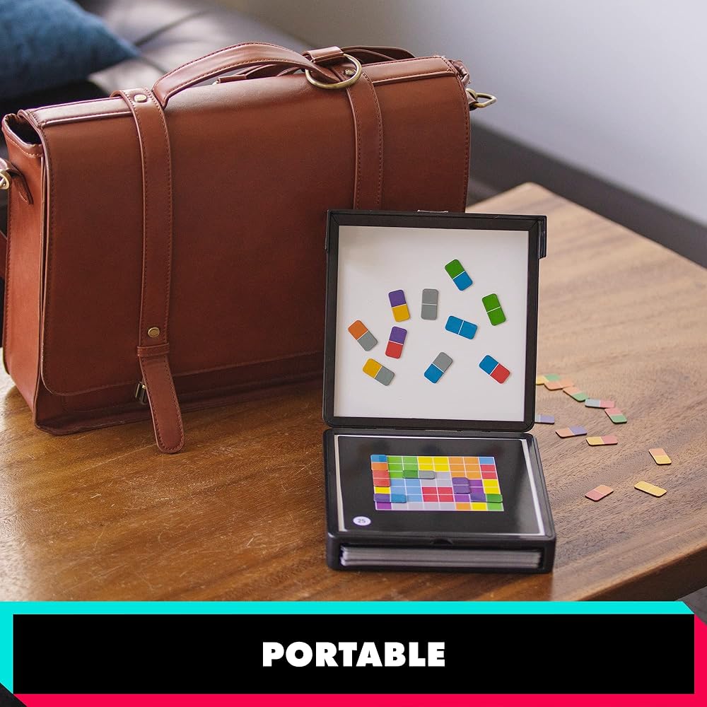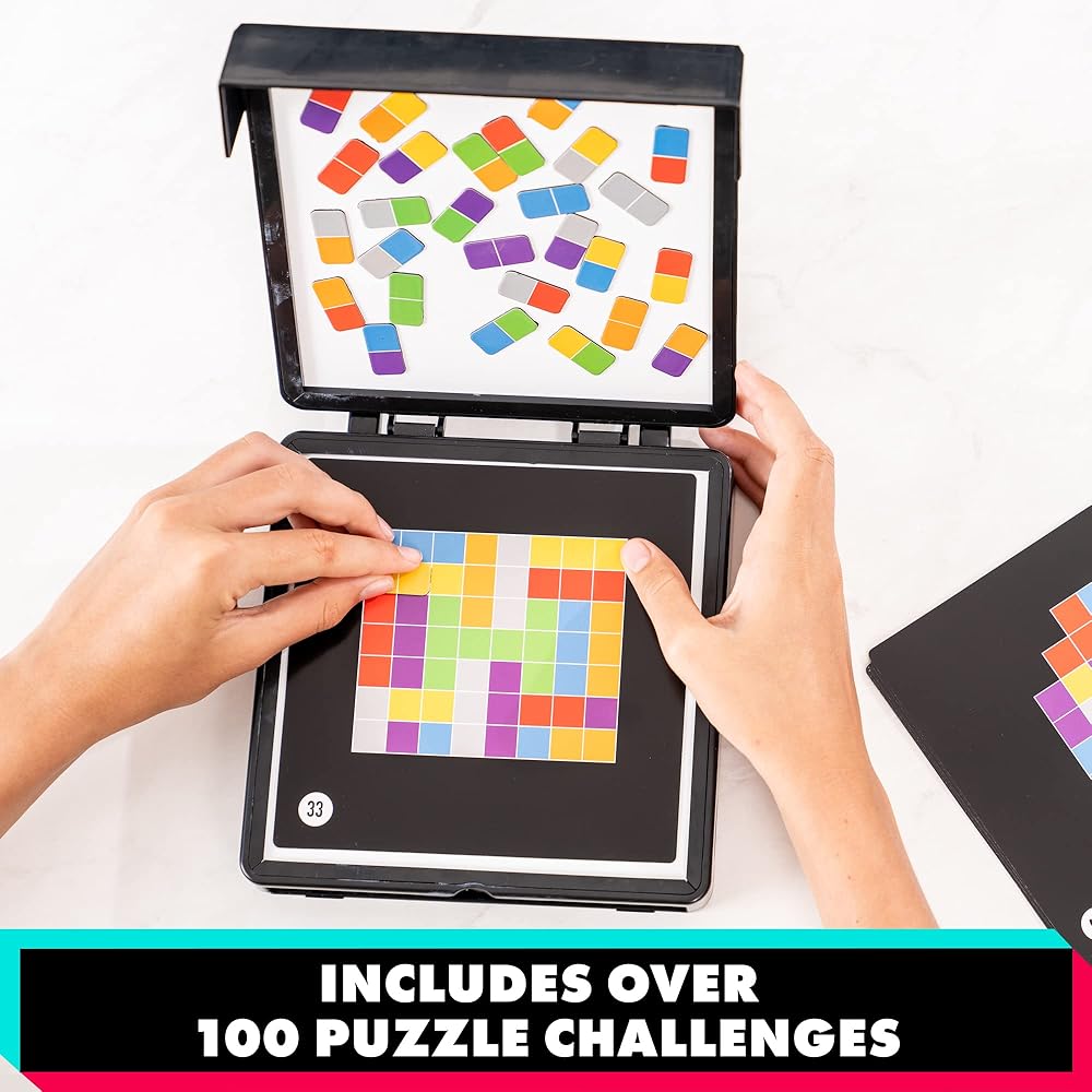 Put your brain power to the test with Kanoodle Duplexity! Spark more confidence and challenge your critical thinking skills with the best-selling, addictive TikTok sensation, brain-bending puzzle game! Use your spatial-reasoning and problem-solving skills to complete this set of 200 logic puzzles. Simply select a challenge card and place it in the case. Then, use two-tone magnetic pieces to recreate the puzzle. Sounds like a snap, but remember, both ends of each piece must fit in the puzzle! Are you up for the challenge? Or will you fall to pieces? Totally portable, Kanoodle Duplexity is perfect for puzzling on the go.