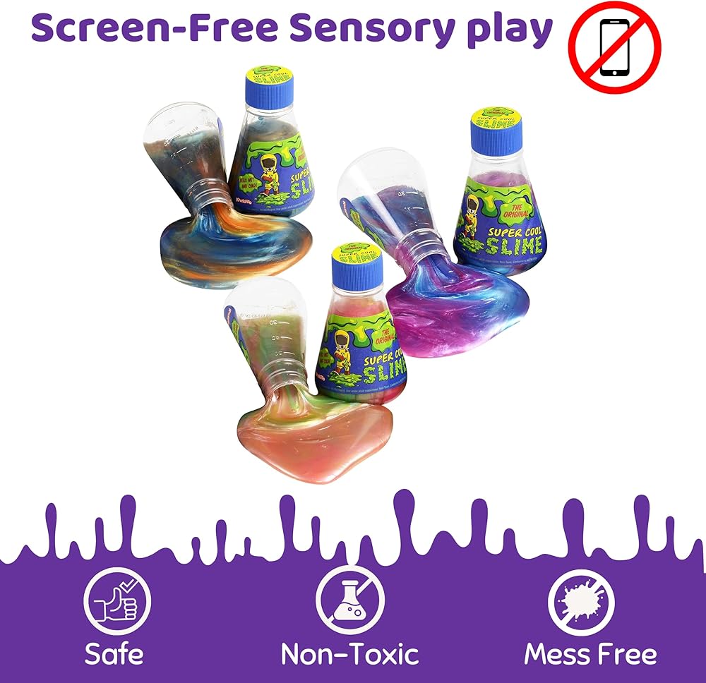 SUPER COOL: THE ORIGINAL SLIME 3 pack - Our Original Super Cool™ Slime feels wet and cold, moves like a liquid but feels like a solid. It's not like anything you've ever touched. Pull, twist, squeeze, and smush the slime to change it's shape over and over. You can even try to build stuff with it. Sliming can keep children preoccupied for hours at end, while dulling their edge to hurl toys and other play things about. Great for mental therapy as it can relieve stress and anxiety, and therefore, help children and adults with focus and generating more calm in their life. Our fun beaker shaped 5 ounce bottles feature slimes in three amazing multicolor metallic designs. Possibilities include Blue/Orange, Purple/Blue and Green/Pink for 15 ounces worth of sensory enjoyment. Great gift Items for stocking stuffers and basket fillers for holidays which also make for great party favors. INCLUDES: 3 full-sized 5 oz bottles of metalilic slime. Slime is Non-Toxic, Unscented, and does not contain any common allergens. Appropriate for ages 5 and above.