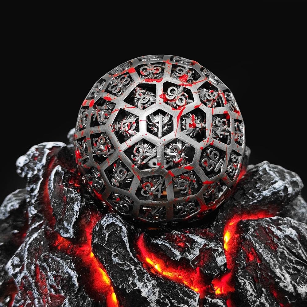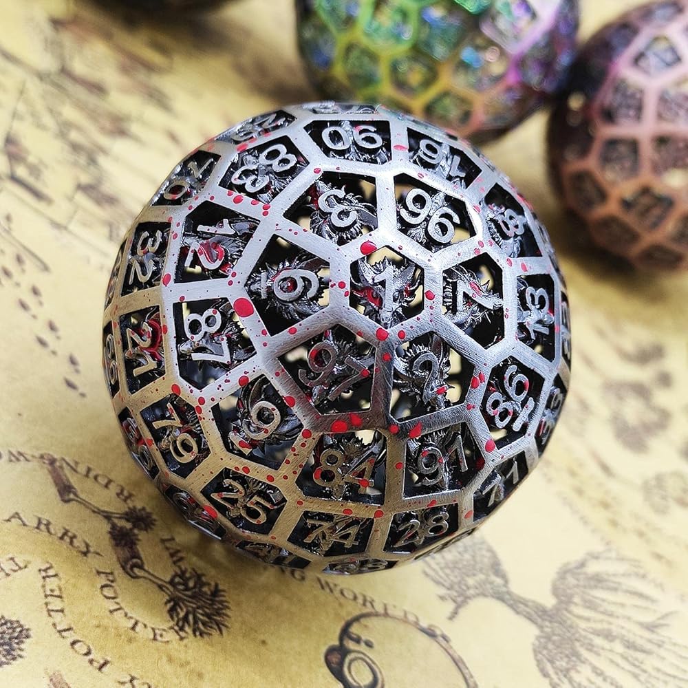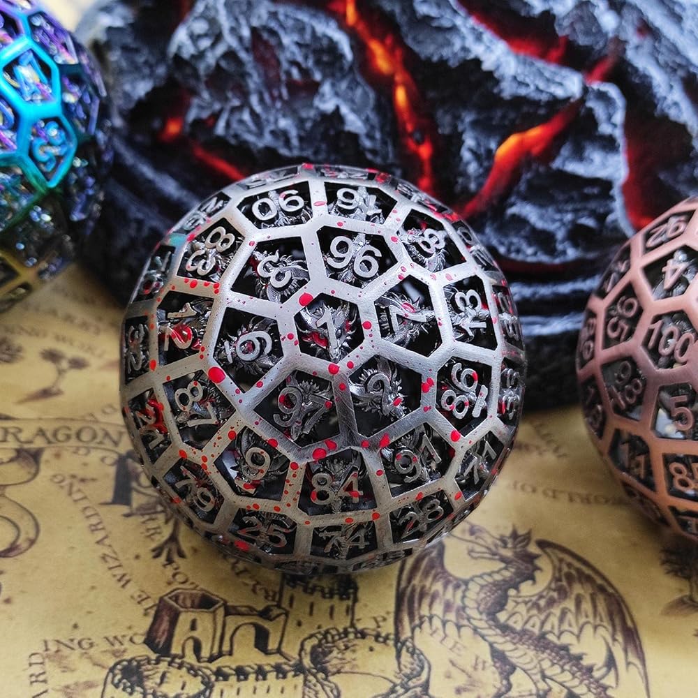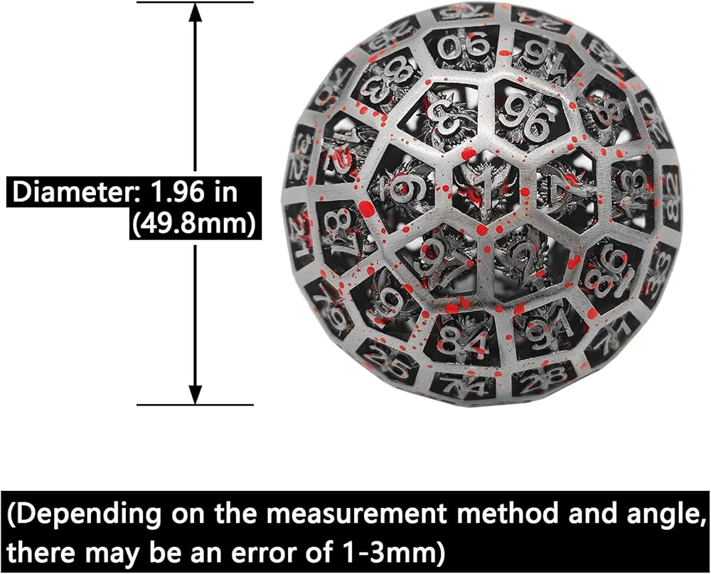Metal Hollow D100 Faced Dragon Dice Set , high quality feel, practical giant dice that are easy to roll. The visual design is exquisite, and the underside of each word is engraved with a complex dragon pattern and hollow design. Satisfying players' needs for looks and utility, it's a great dice and the perfect gift for a dice lover or gamer!