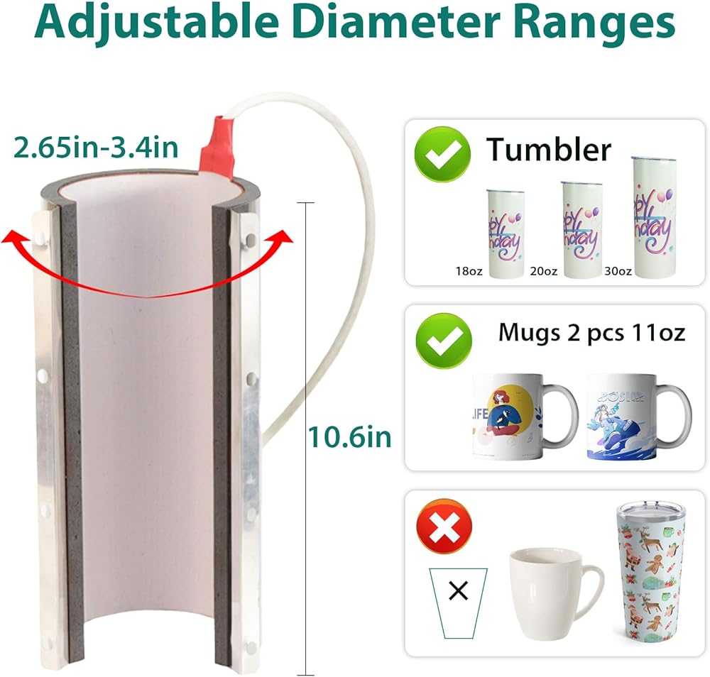 Application Range- The tumbler press machine is suitable for kinds of capacity of cups and made of metal, which is smaller, lighter, and evenly heated. The sublimation tumbler press is suitable for 11-30 OZ skinny tumblers, straight mugs and and other high-temperature resistant materials for the cup material. Maximum Heat Press Cup Volume: 30 OZ. Maximum Cup Height: 10 Inches.