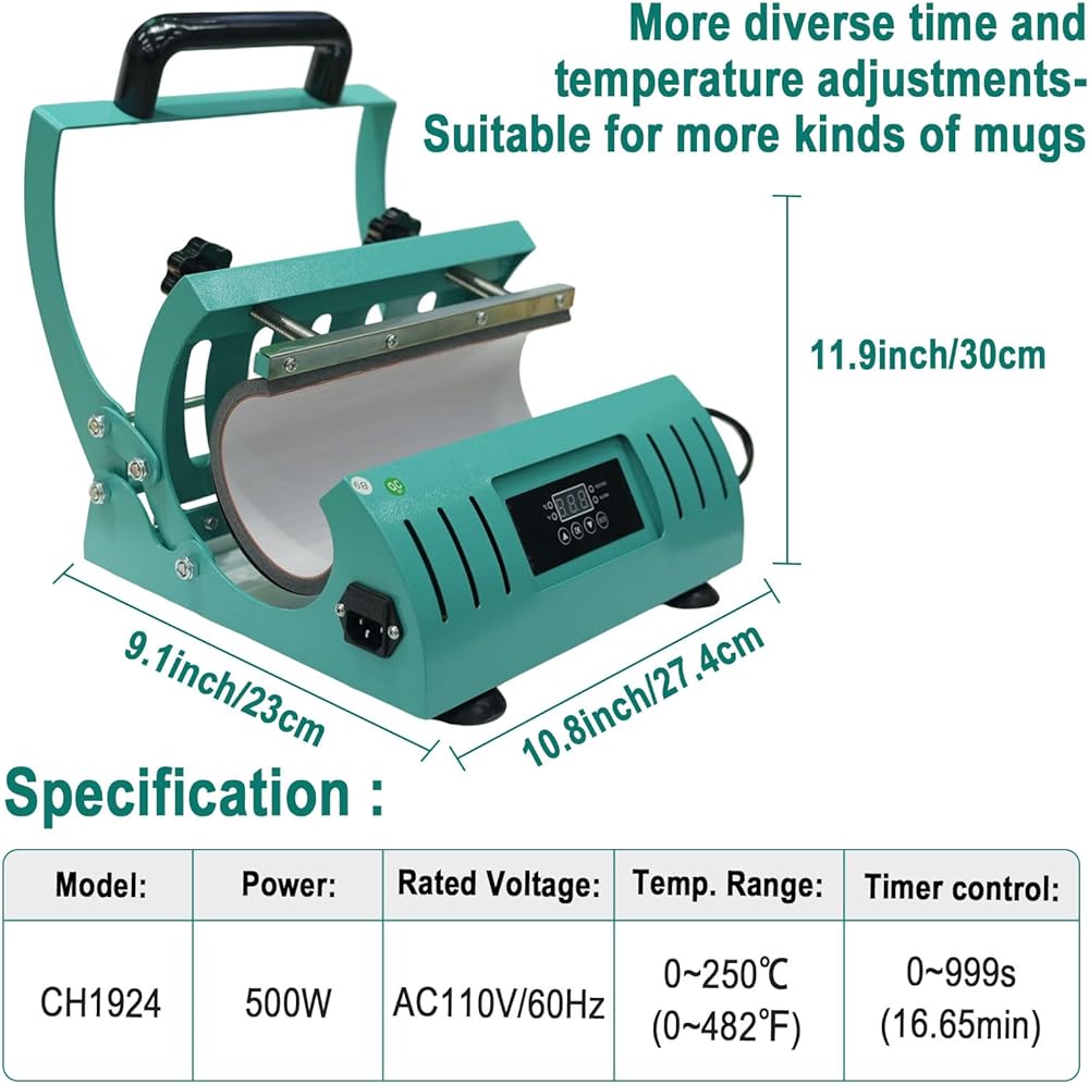 Parameters- Graded tumbler heat press machine can heat sublimation tumblers of 11 - 30 OZ, 110V 500w with overheat protection device, faster and safer heating. Compatible diameter: 6.8 ~ 8.7cm Max, Printable Length 25cm, the size of the machine is 300 x 274 x 230mm( 11.9 x 10.8 x 9.1"). The tumbler rotating machine temperature 0~250℃ (0~482℉), and the preset time is 0~999s. s. The mug heat press machine allows you to transfer colorful pictures on 11-30oz sublimation mug or skinny tumbler.
