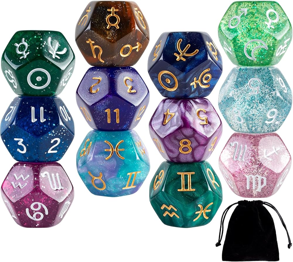 QTY AND SIZE: You will get 4 sets of astrological dice, including 12 pieces D12 Astro Dice. Each astrological dice is approx. 20 mm/ 0.78 inch in diameter which is bigger than standard dice (16 mm/0.63-inch diameter).