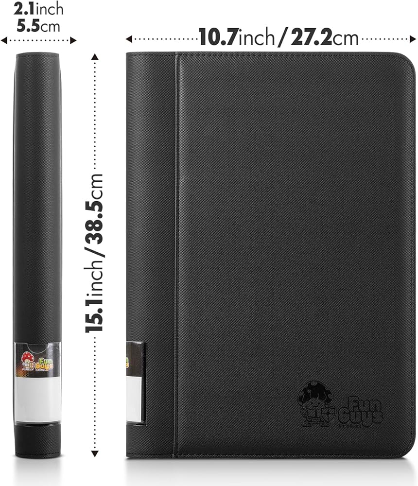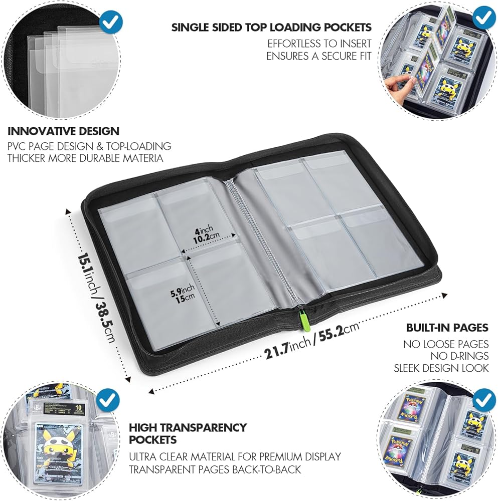 UNIQUE FEATURES – Our trading card binder has a custom-designed spine that helps prevent cards from bending and allows for larger storage capacity. Take your PSA-graded cards wherever you go! Exterior dimensions: 14.8 X 13.6 X 1.8 Inches.