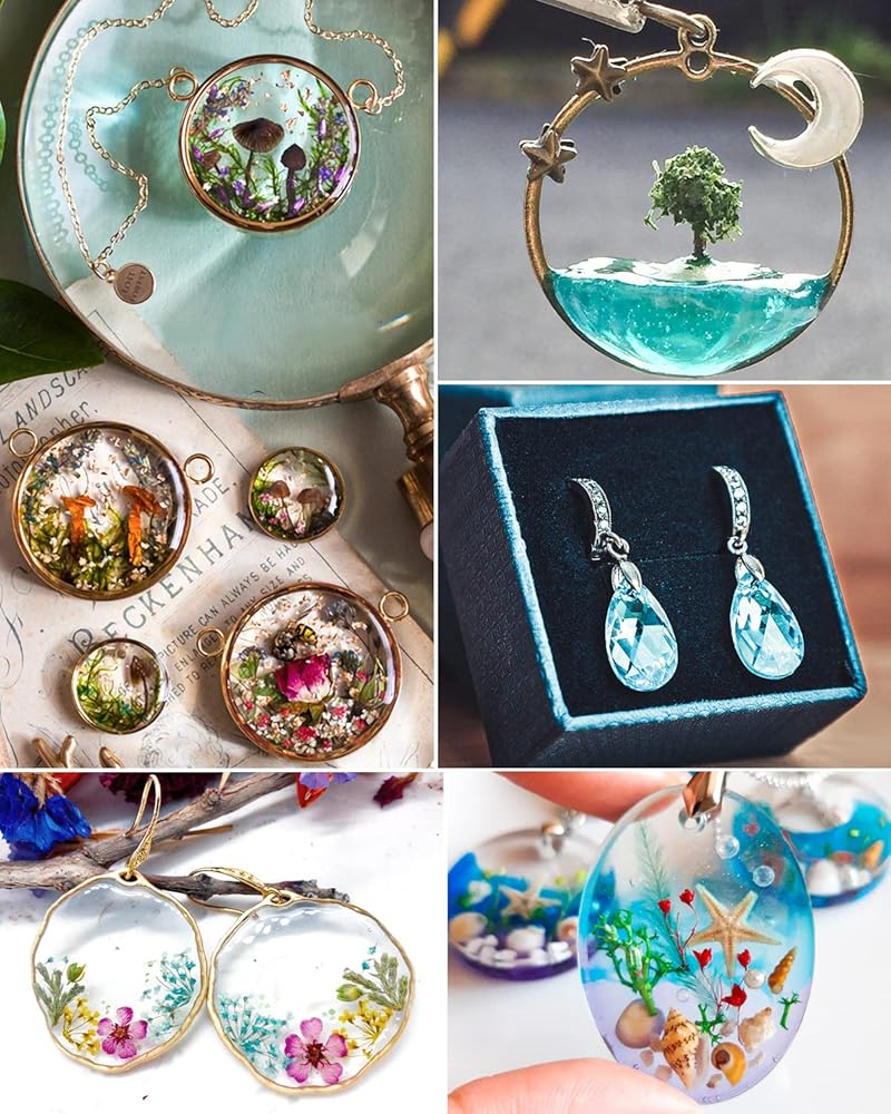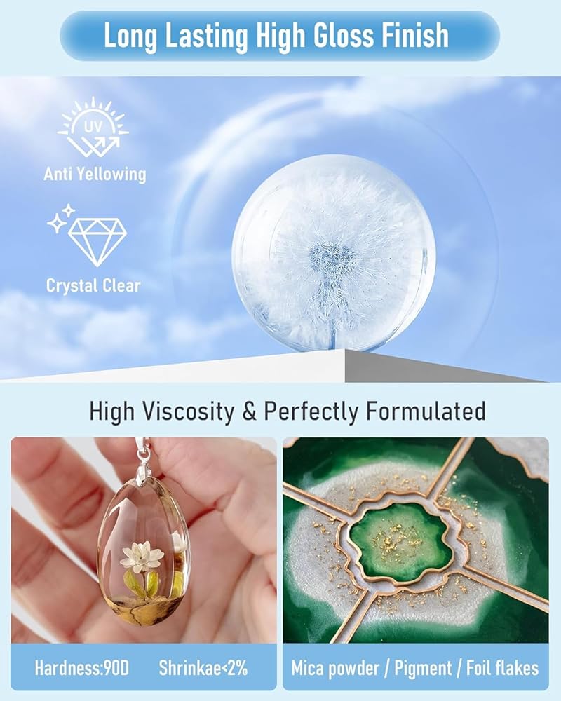 【Wide Application】: This clear uv resin has a viscosity of 3000-4000cps, Hardness up to 90D after curing. Perfectly formulated to be mixed with mica powder, pigment, and foil flakes for a vivid, stunning result, can be used for craft projects and jewelry making, such as keychains, badges, pins, earrings, rings, pendants etc.