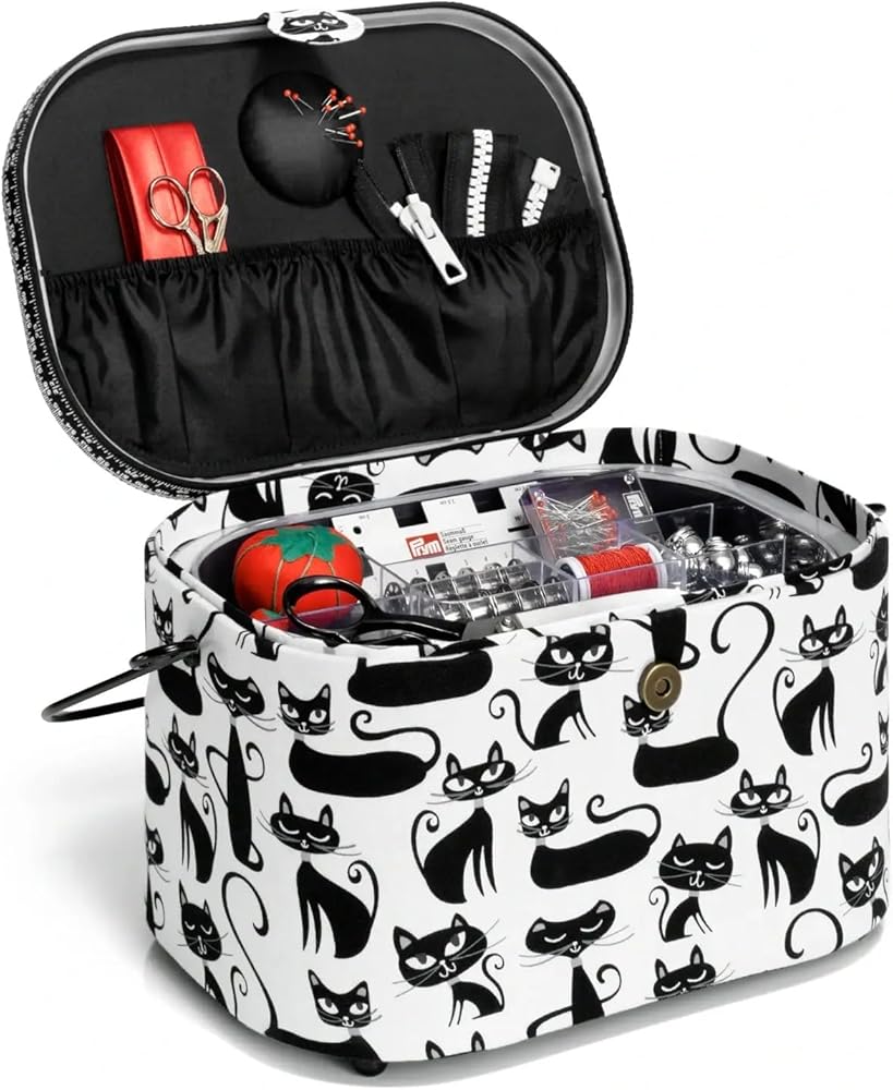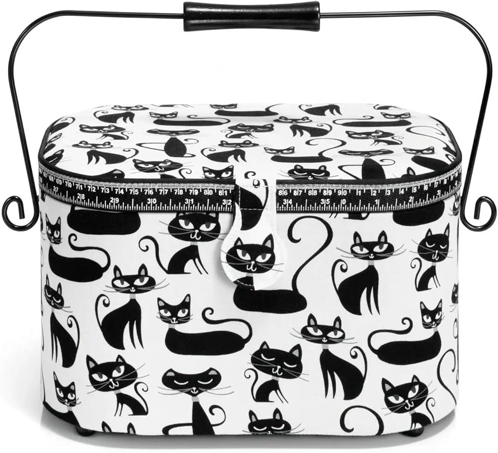 The enchantingly decorative pattern of woodland animals and trees, the unobtrusive light blue background and the elegantly curved metal handle underline the elegance of this sewing basket. In the interior, there is a transparent, removable plastic insert with seven compartments for storing haberdashery. Overall, the sewing basket is very roomy and offers space for all your sewing accessories. In addition, there are the integral pin cushion and two fabric pockets sewn on to the underside of the lid, which ensure that your needles and small items are kept neat and tidy the way you like. The interior is lined in a light blue fabric, which picks up the color-coded theme of the outer cover fabric. This sewing basket is both ideal for storing your sewing things and for transporting them to the next sewing course.
