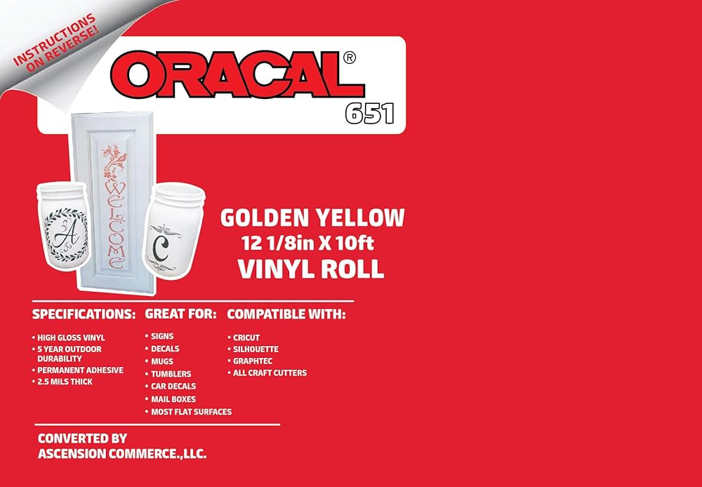 Oracal 651 vinyl is perfect for your crafting needs. Oracal film is compatible with all craft cutters, including the Cricut, Silhouette, Xyron, Craft ROBO, Graphtec, and more. It is a intermediate calendared vinyl, measuring at 2.5 mils in thickness. Manufactured in the United States, this is a high quality vinyl with consistent results. Easy to weed and durable, Oracal 651 is ideal for use on tumblers, window decals, car decals, signs, stencils, scrapbooking, or any other permanent application with a semi-smooth surface. The repositionable, pressure-sensitive adhesive means the media can be moved during a dry application and lightly repositioned it until it's just right. This vinyl has a gloss finish that truly stands out from the competition.