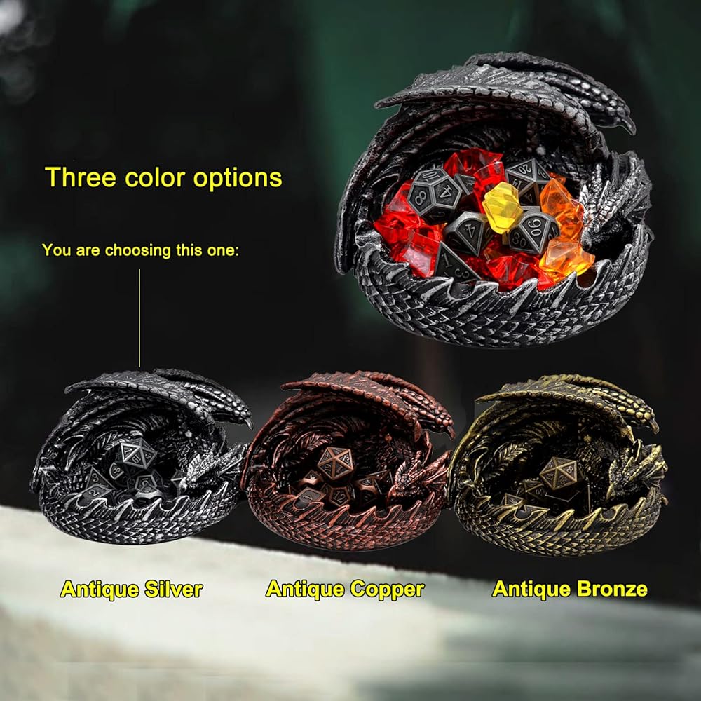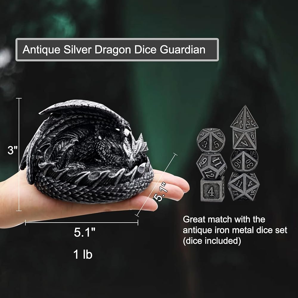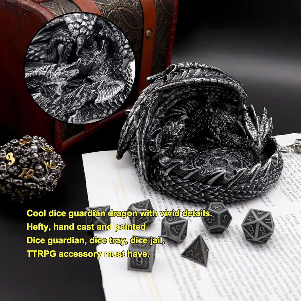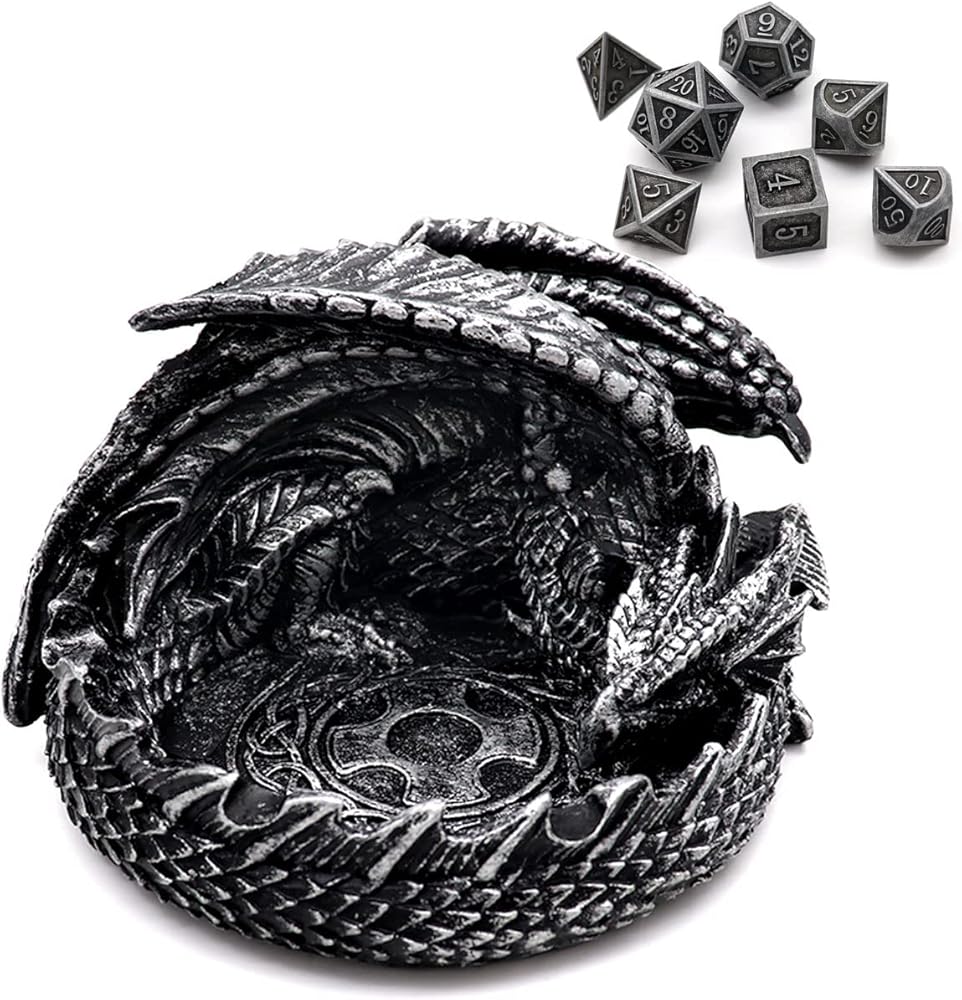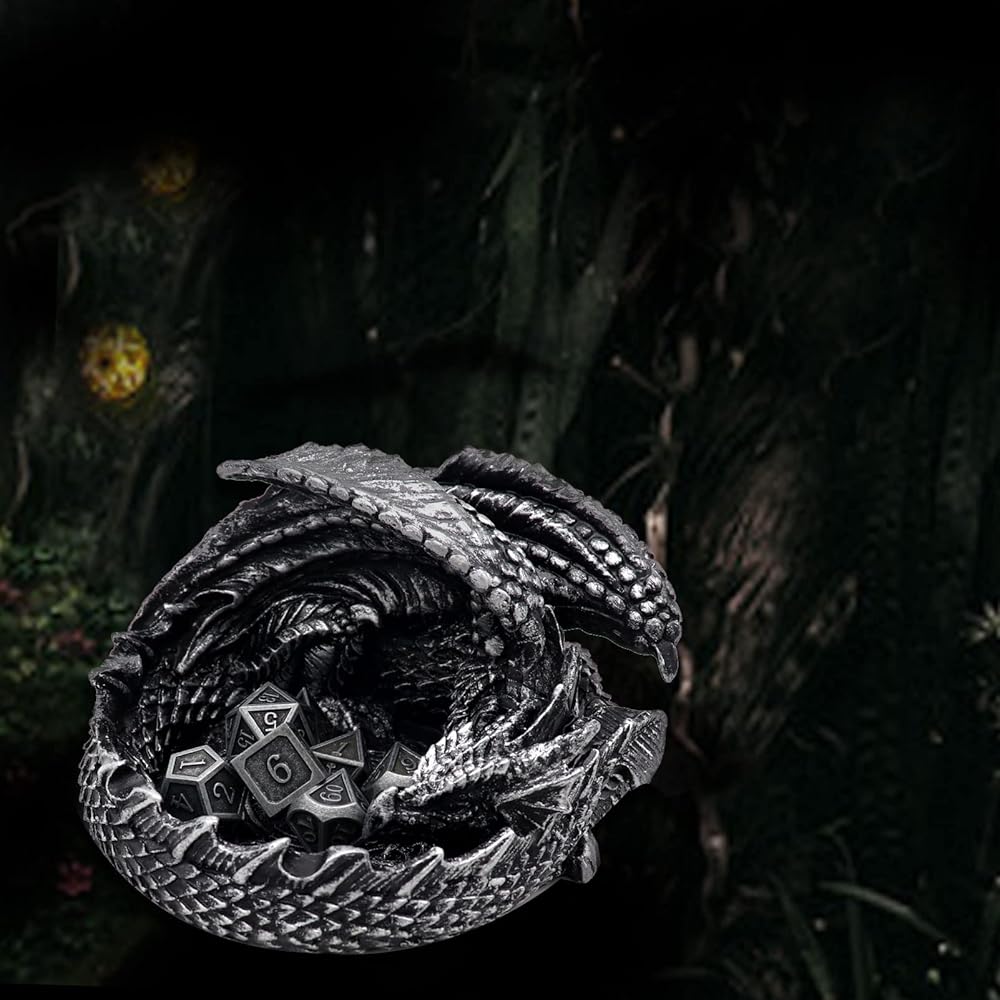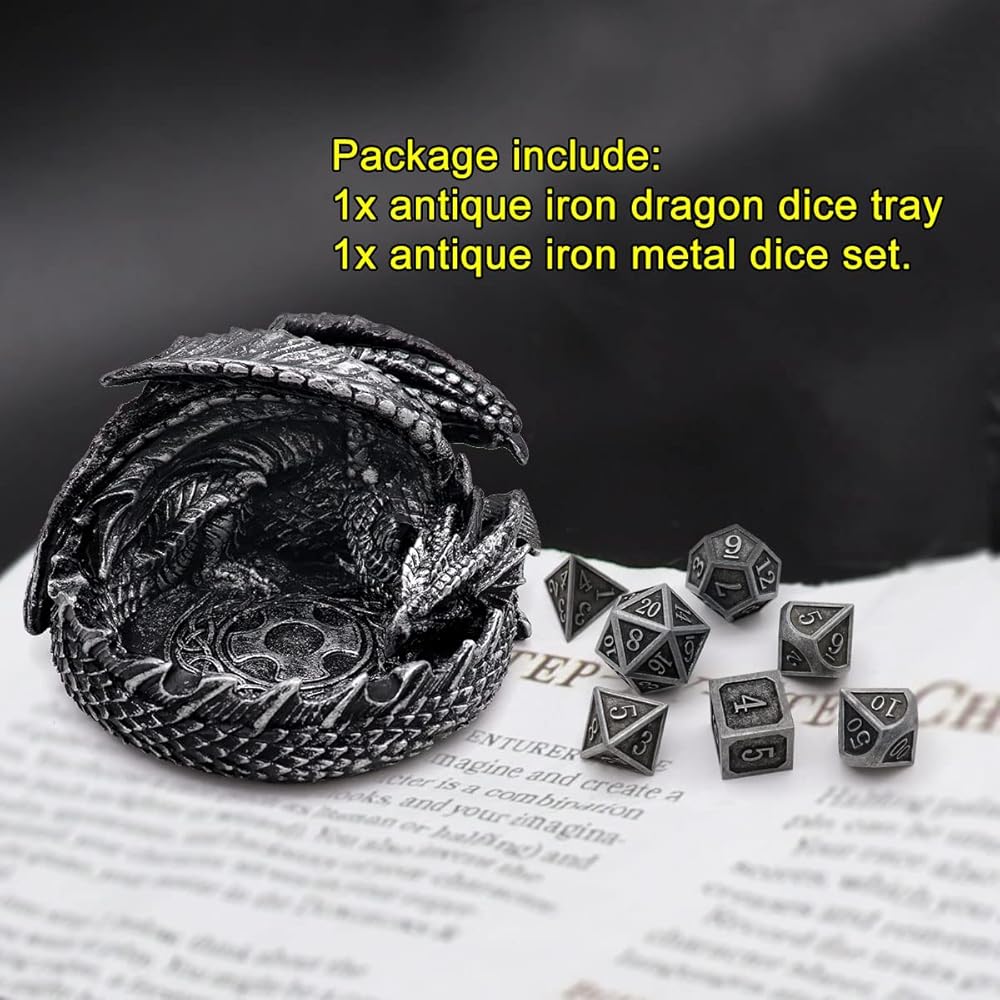 Novel DND Dice Holder with Metal Dice Set: Each dragon tray is hand cast, polished and painted to produce wonderful details of an ancient metallic dragon from wings all the way to scales. Polyresin base gives it great heft to work perfectly as dice tray, dice holder or even a dice jail! Together with the dice holder, there will be a set of metal dice of 7pcs for your dnd game play!