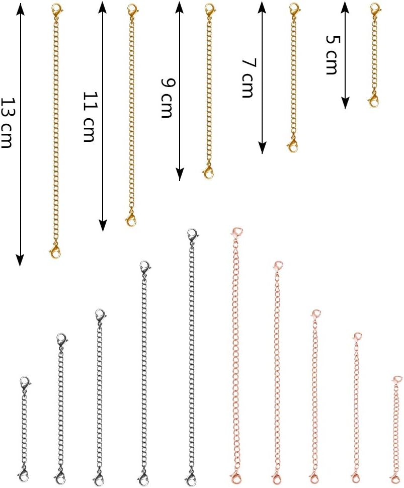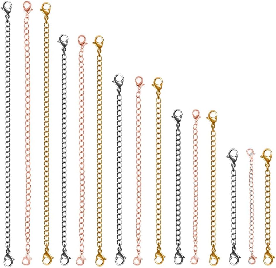 These safety extension chains made of stainless steel, which is solid and durable,which can clasp the ends of your necklace closely and easy to put on and take off and can meet your various needs.There are15 necklace(5 different length, 2 inch, 3 inch, 3.5 inch, 4 inch and 5 inch) extenders and 3 different colors (gold, rose gold, silver).these extenders are fit for expanding the length of necklaces, bracelets or anklets, you can choose the appropriate length according to your neck, wrist, ankle.This products are convenient for daily use and Store it in a dry environment after use to avoid bacterial growth.