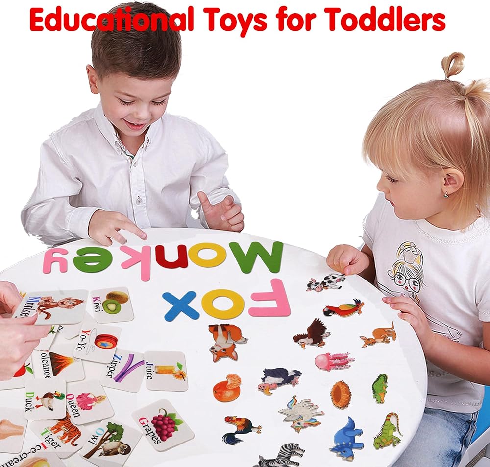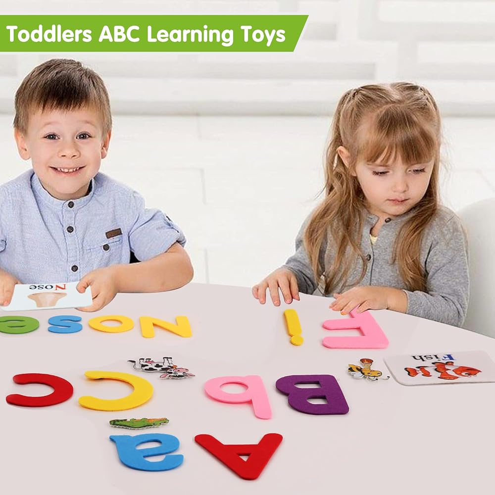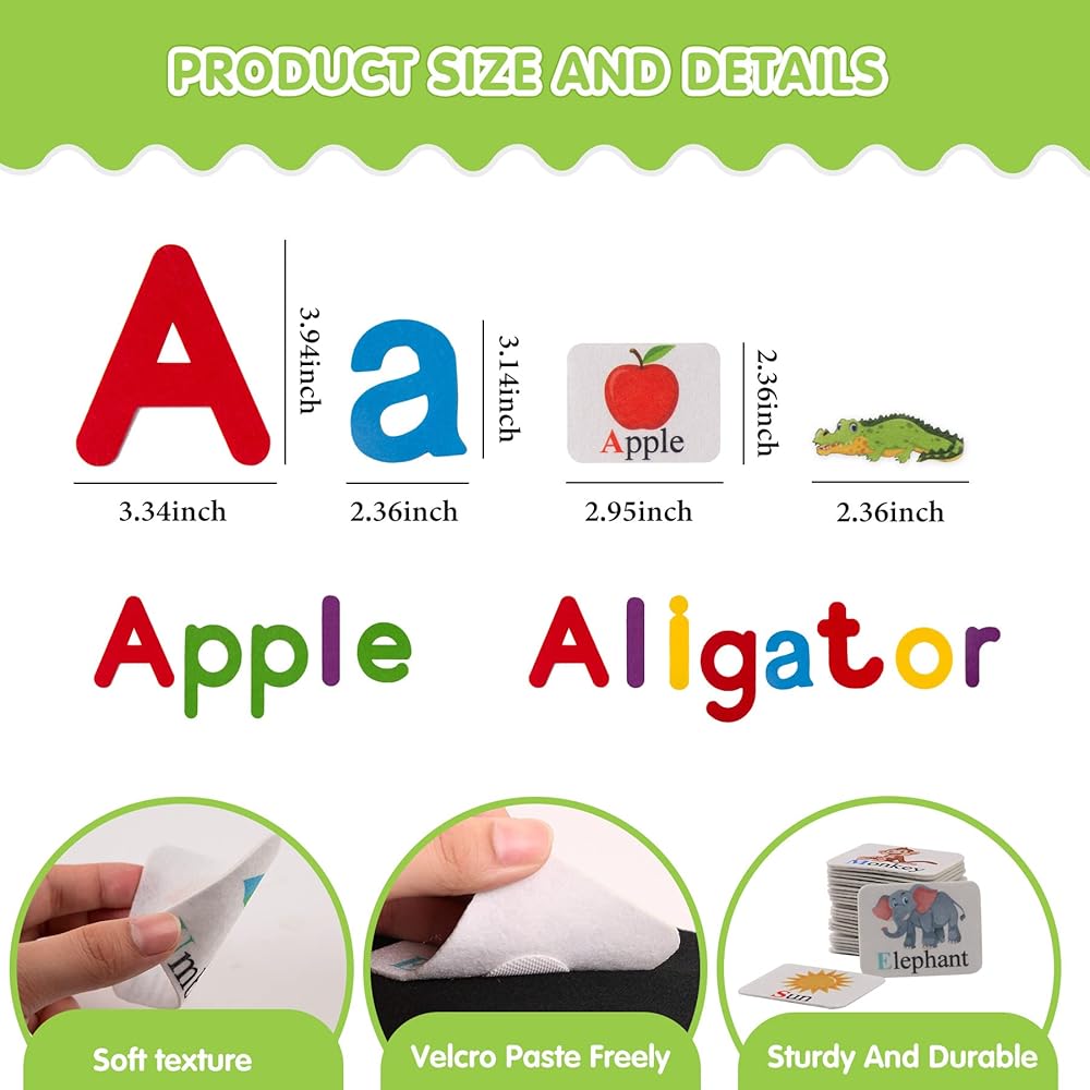 Uppercase letters, lowercase letters, matching alphabet flash cards, Such as" A a" is for " Apple" flash card, and felt animals figures;