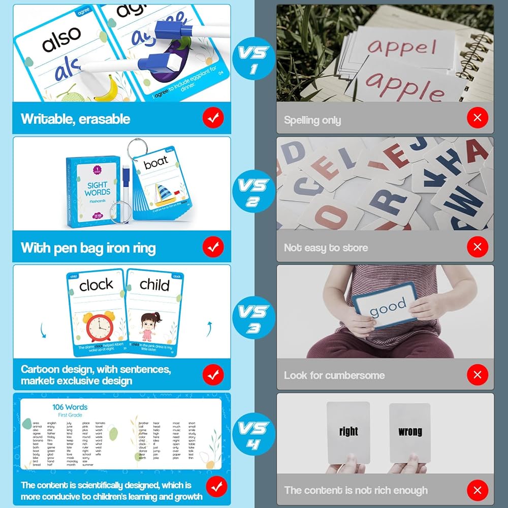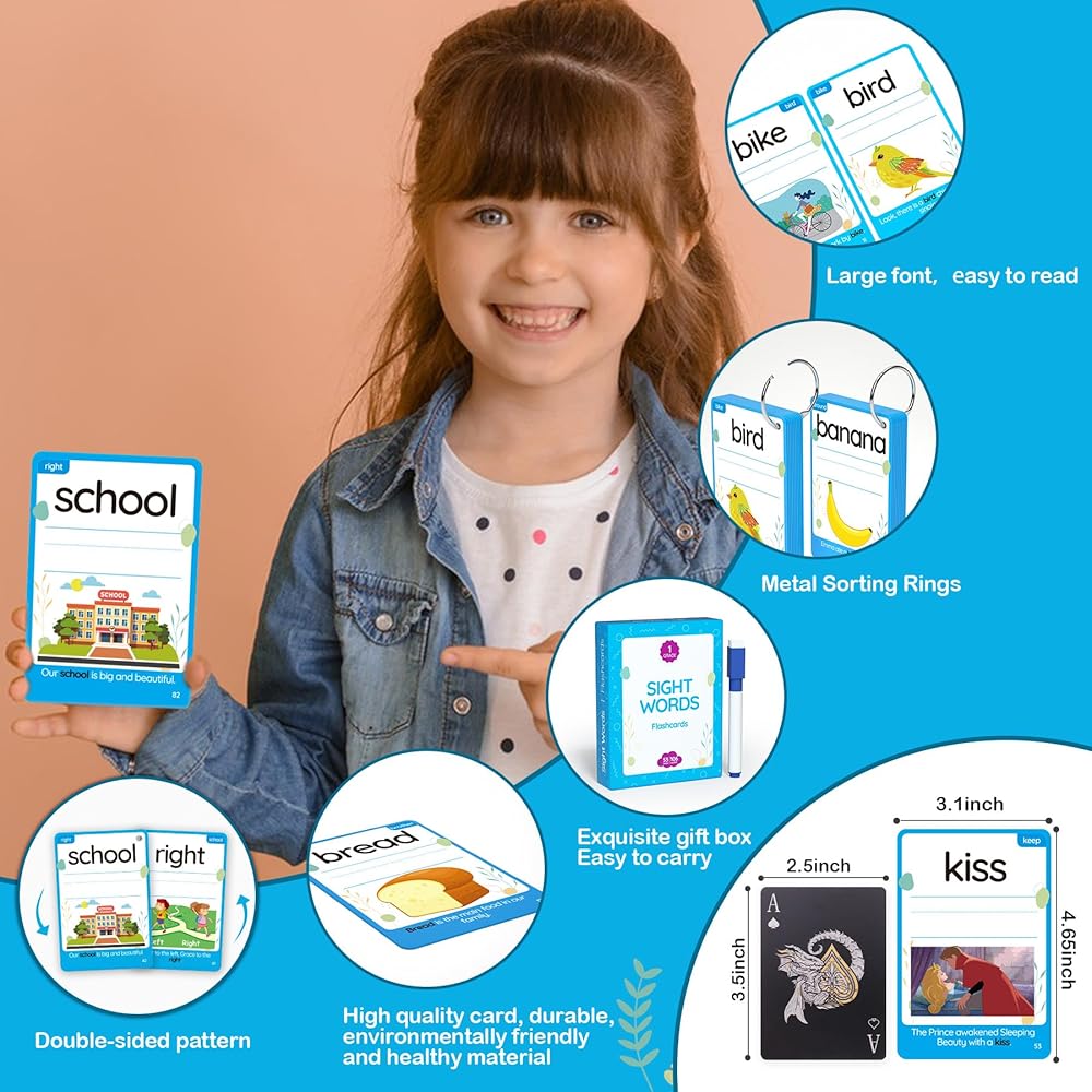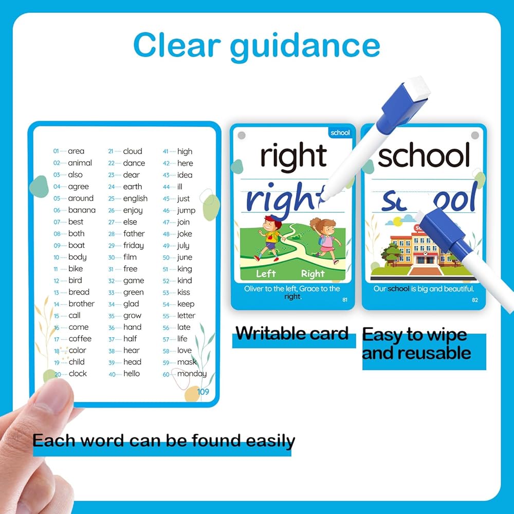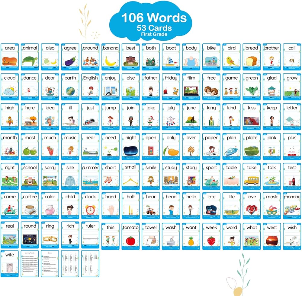 WJPC 55 Cards, 106PCS High Frequency First-Grade Sight Words Flash Cards, 1st Grade Phonics Learning Cards for 5,6,7,8 Years Ages Kids Boys, Girls Learn to Read, Write, Association, Sentence Making