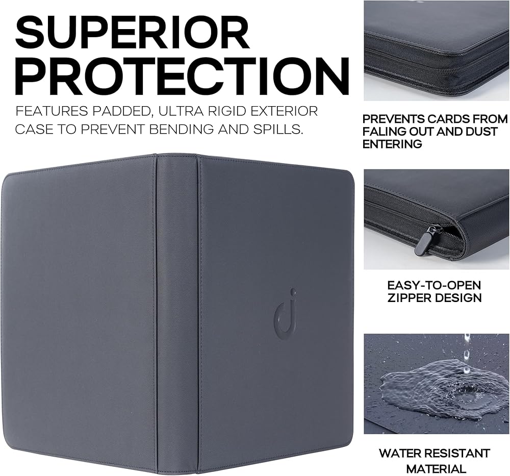 SUPERIOR PROTECTION - Features padded, ultra rigid exterior case to prevent bending and spills, and elastic strap to keep your cards from falling out. This water-resistant 12 Pocket trading card binder offers maximum security and trusted durability for your trading cards.