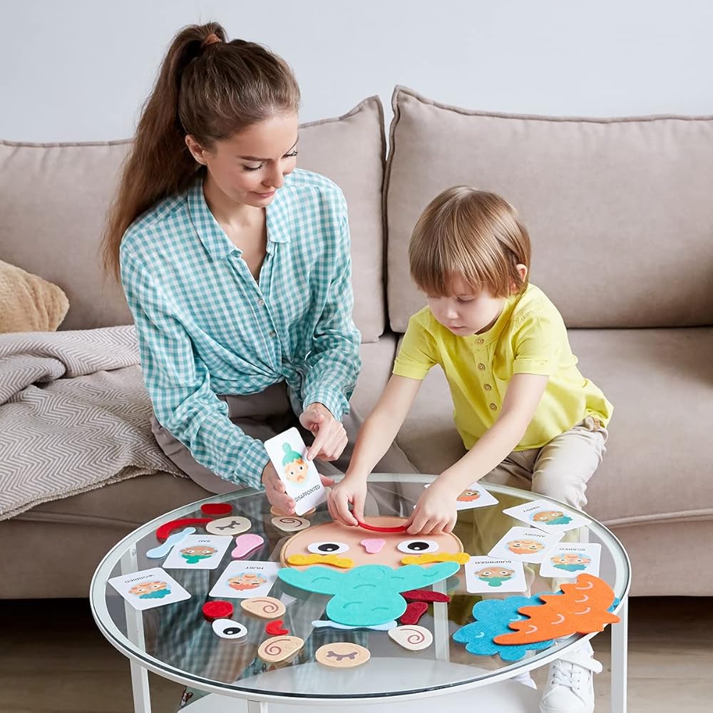 OPEN-ENDED MONTESSORI PLAY - Use these multi-use soft felt elements to create any face you like! Is it hair, a beard, or eyebrows? A smile or a frown? This social-emotional game includes a double-sided face board with two skin tones, 28 soft facial expression elements to attach to it, nine flashcards, and a cotton storage bag.