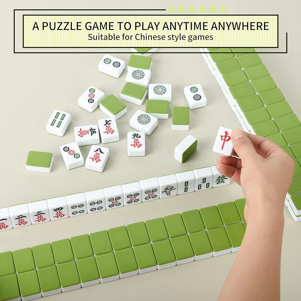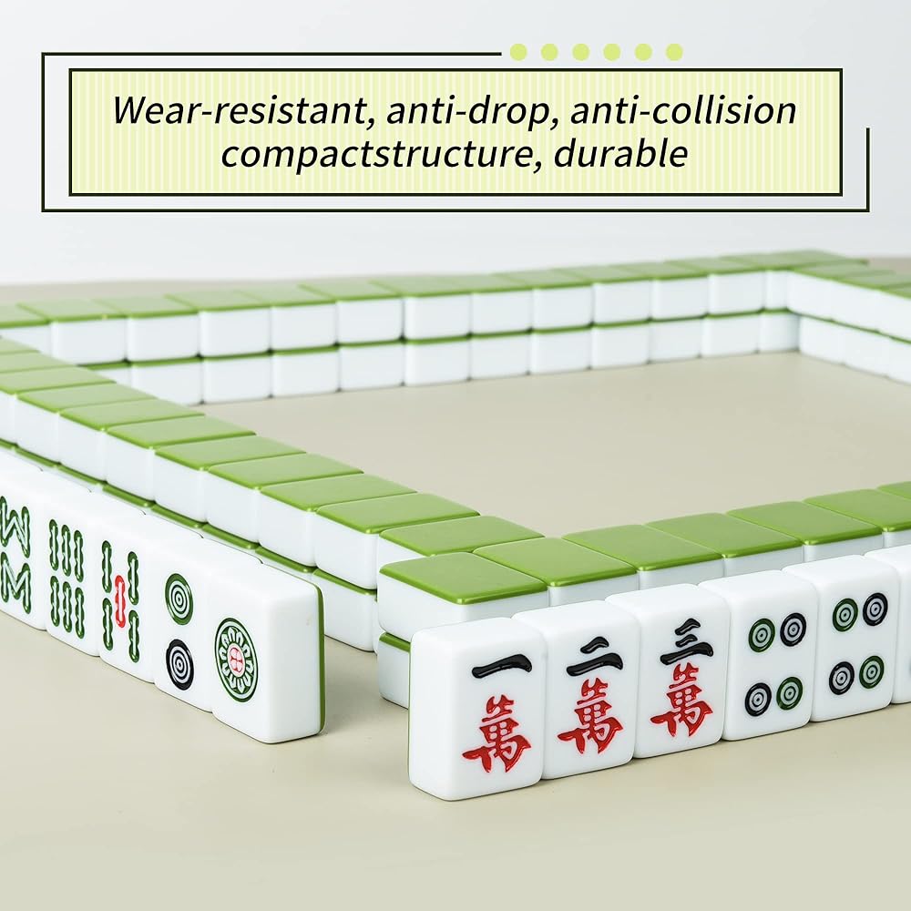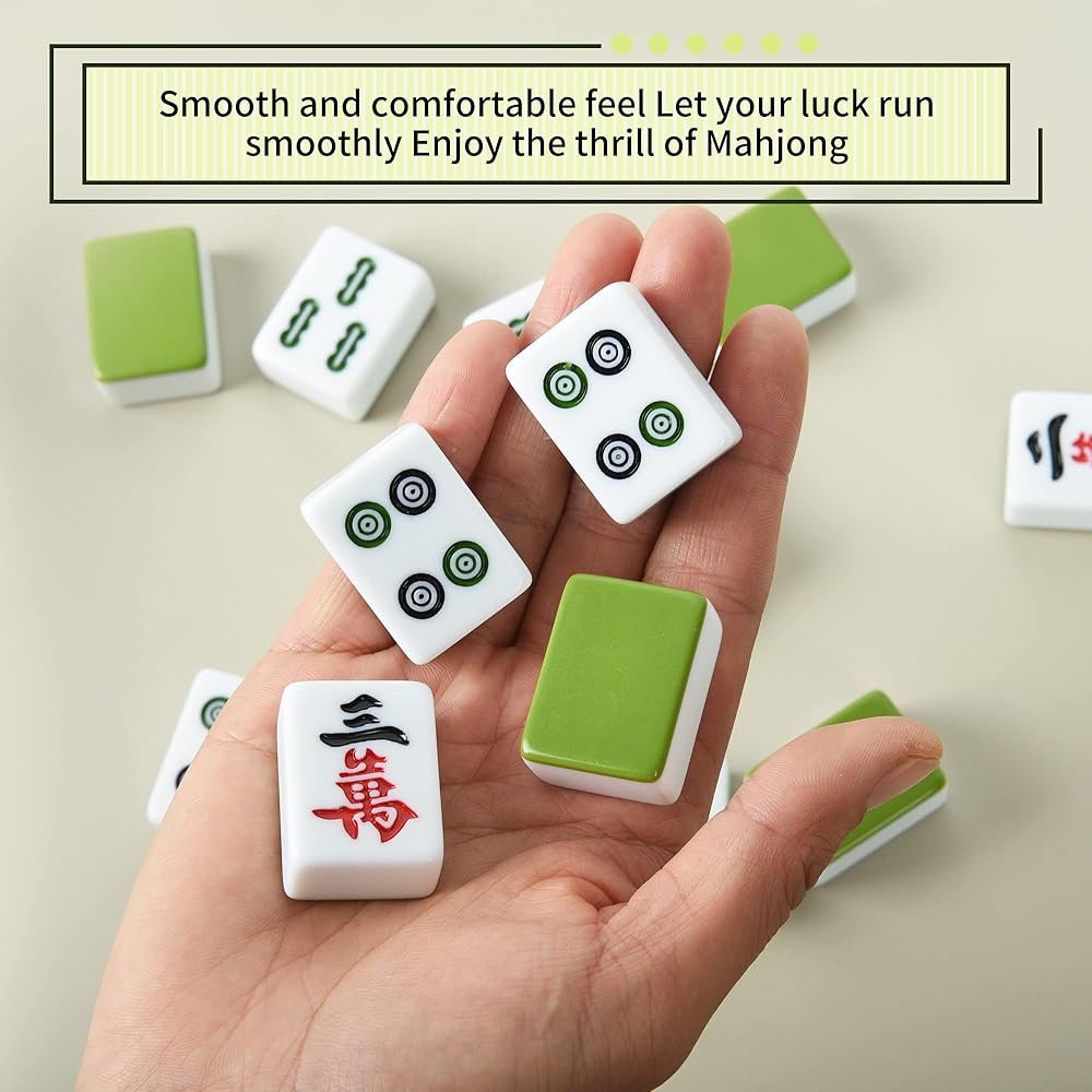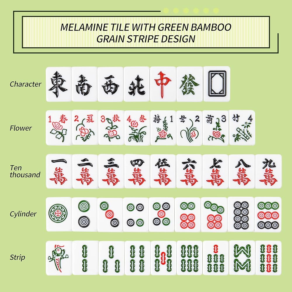 【144 Scratch-Resistant Green Tiles】 The set includes 36 circles, 36 bamboos, 36 characters, 12 dragons, 16 winds, 8 flowers and seasons, 2 blank spare tiles, 4 dices, Tiles measure 1.18 x 0.88 x 0.55 inch (3 x 2.25 x 1.4 cm).