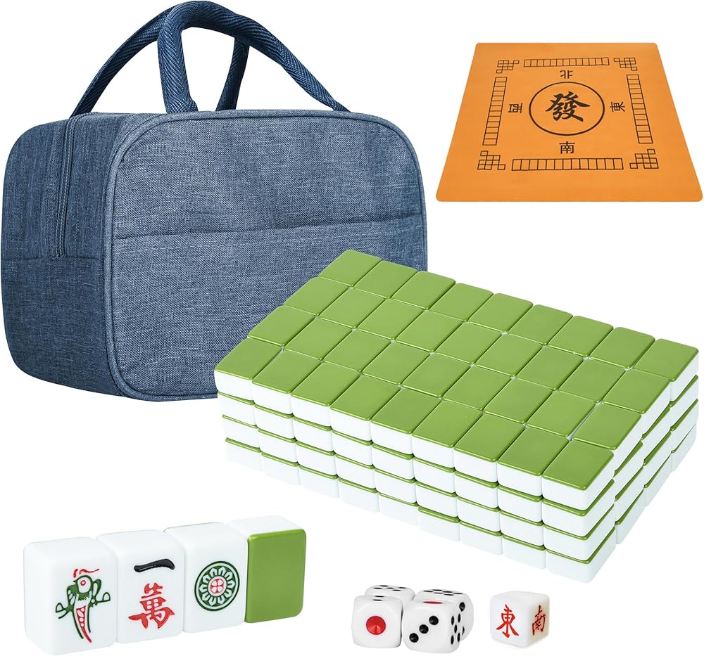 Chinese Green 1.17 Inches Compact Mahjong Set, Travel Small Size, 144 + 8 Blank Melamine Tiles, with Portable Travel Handbag Complete Mahjong Game Set - (Majiang,中国麻将)