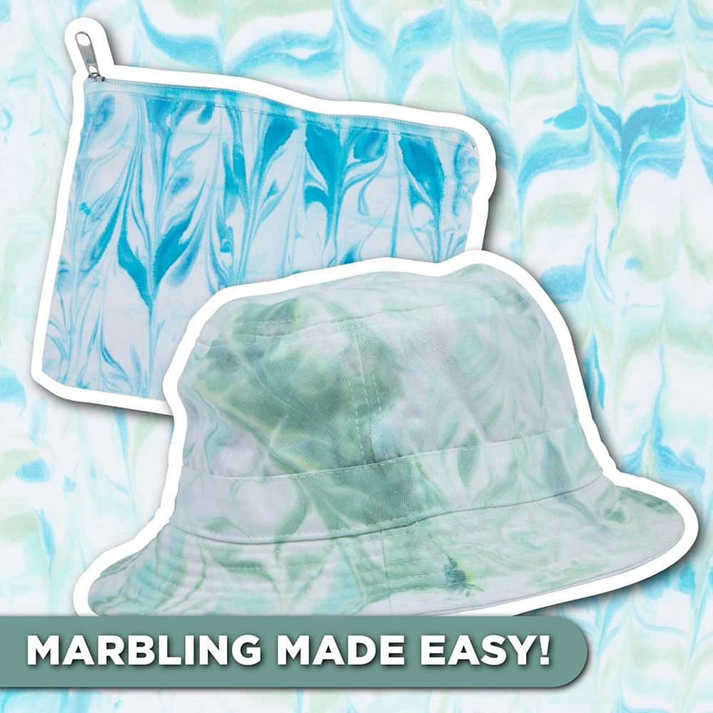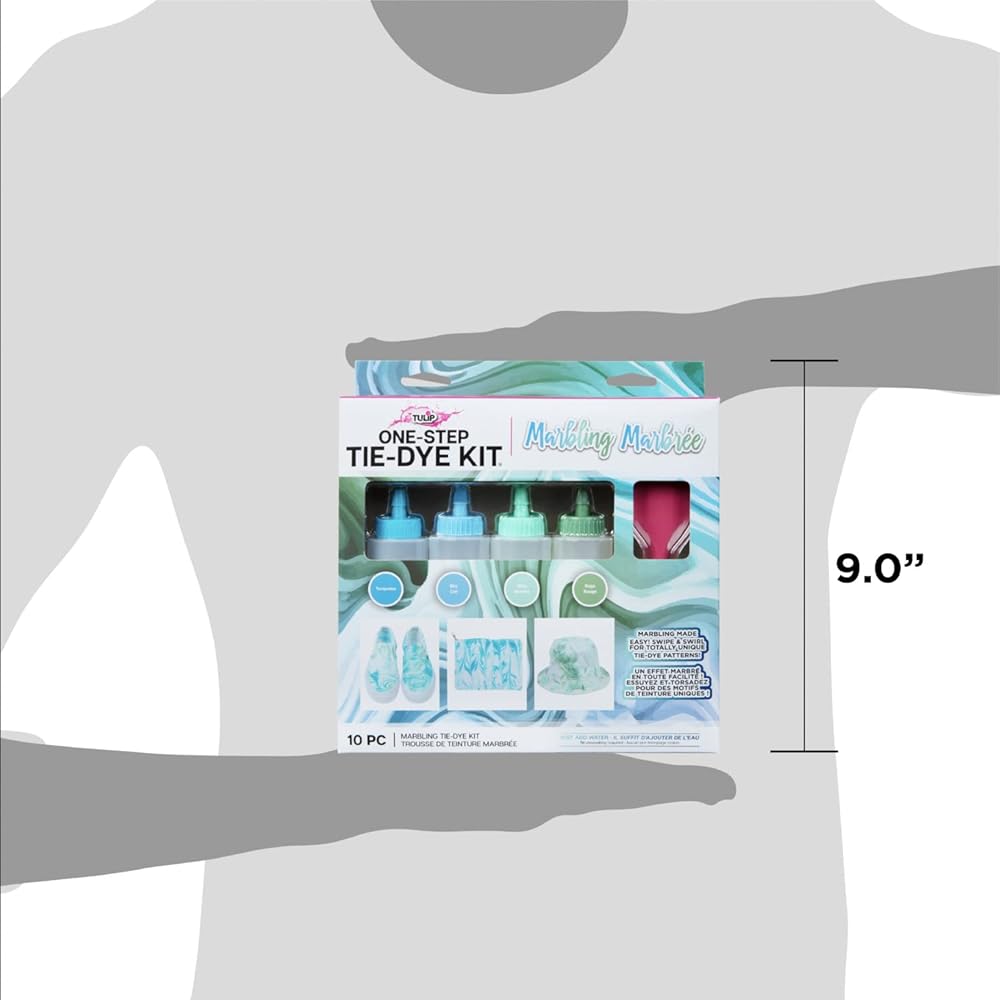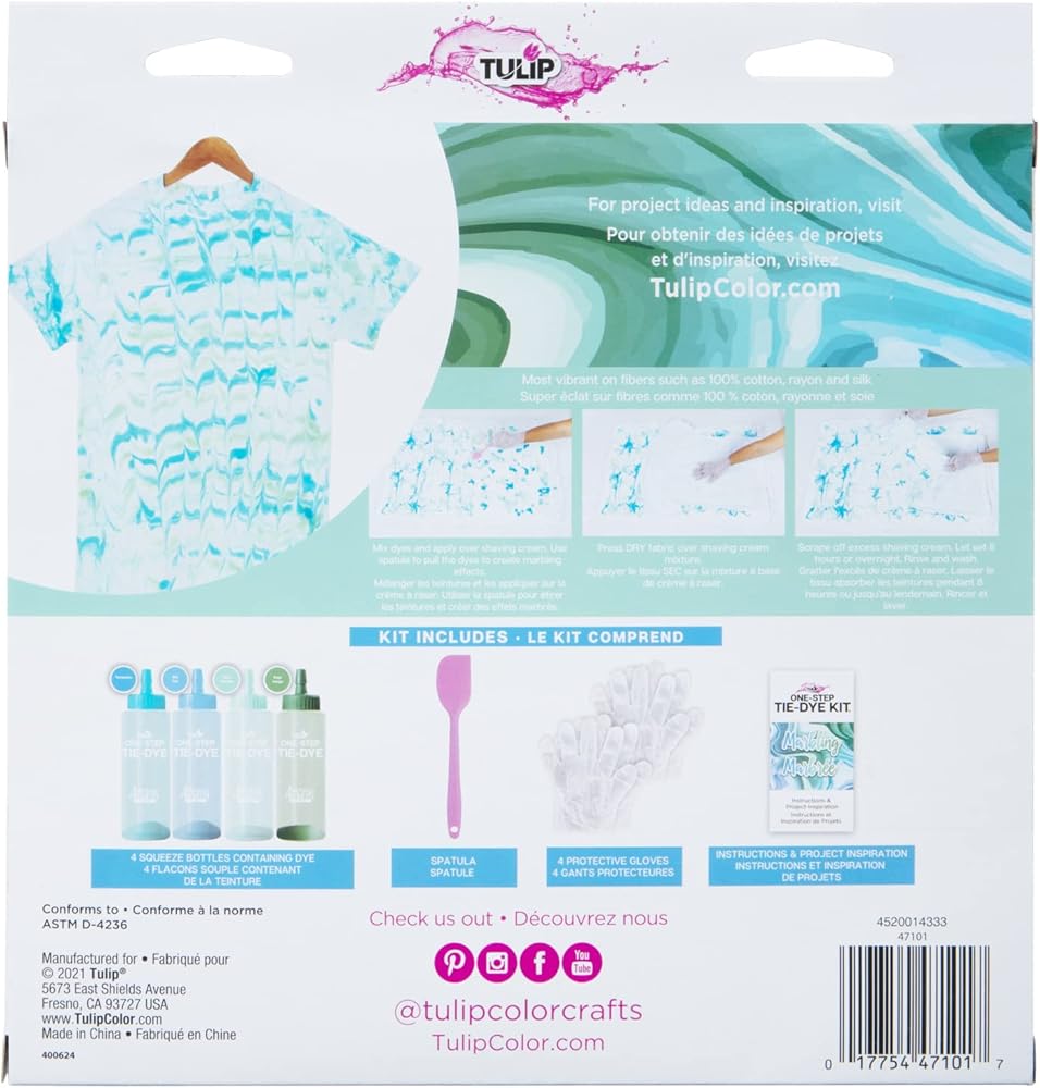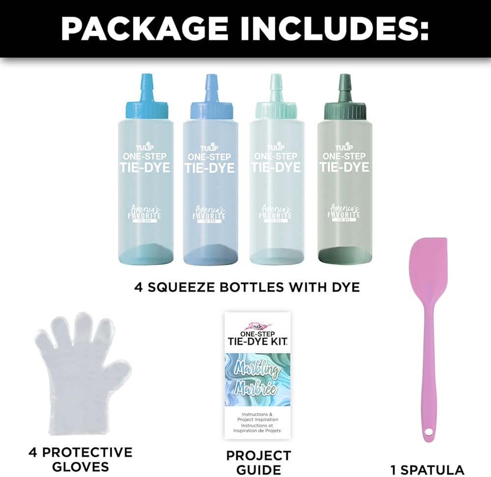Swipe & swirl your way to totally unique tie-dye patterns with the Tulip Marbling One-Step Tie-Dye Kit! This easy-to-use tie-dye kit comes with the tools and special instructions you need to create vibrant marbling effects on fabric. Stocked with (4) 2.75 fl oz bottles of One-Step Dye (turquoise, sky, mint and sage), plus a spatula, protective gloves and a marbling tie-dye instruction guide. Pair the dyes with foam shaving cream for a super fun, super easy way to create marble dye patterns on clothing, shoes and so much more. No two projects are ever alike! Great for experiencing a different way to tie dye, and gift giving too.