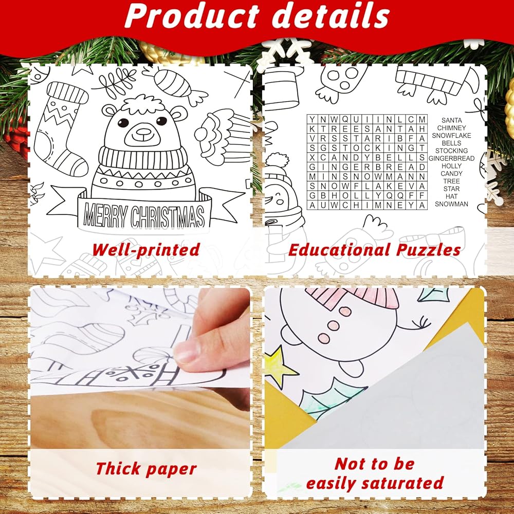 The holiday color-in DIY tablecloth has an educational function. Except for the iconic patterns of Christmas creatures like snowman, Santa Claus, Gingerbread... and classic holiday decorations like Christmas trees, candy bags and Christmas stockings...,the giant coloring poster is also designed with puzzles like maze games and word games and can arouse your kids' interest and are beneficial to the students and kids' creativity and development.