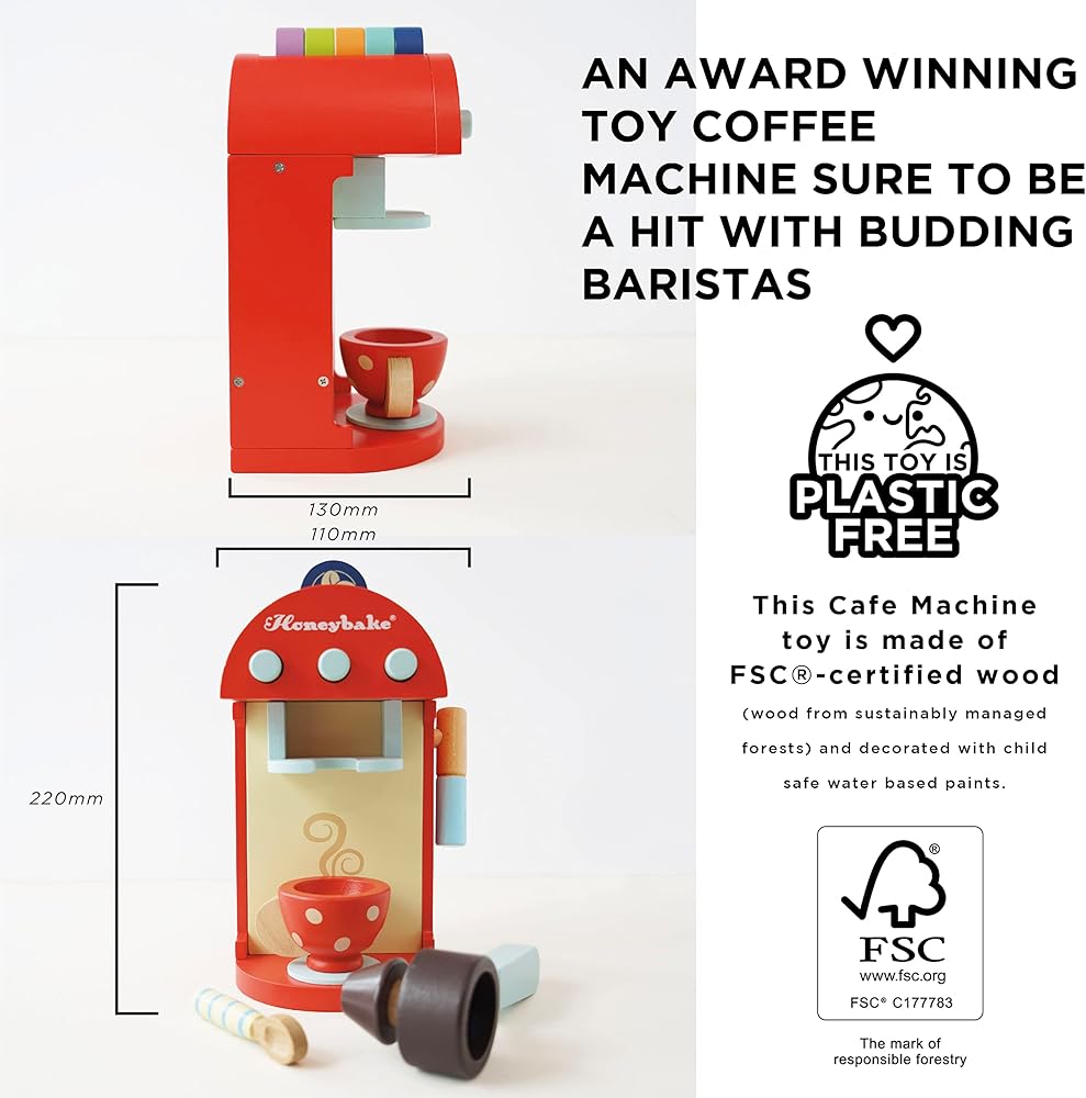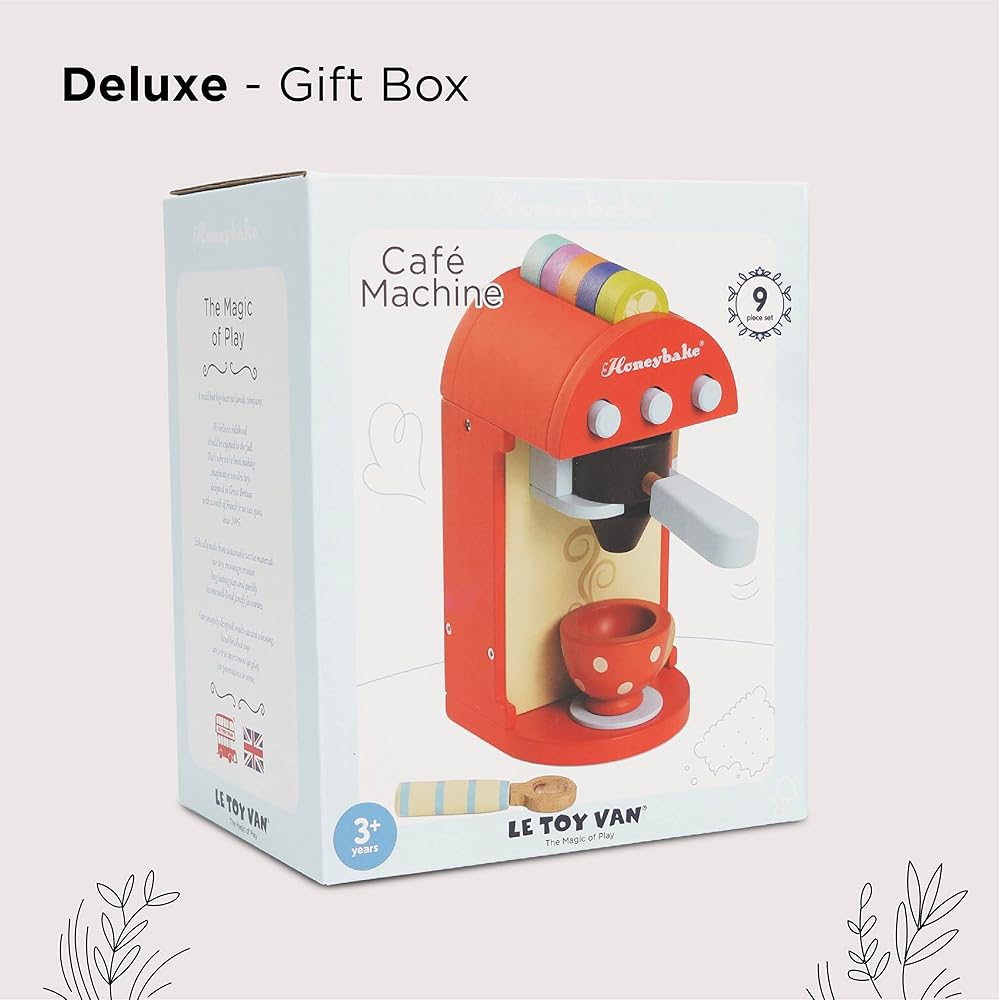EXTEND PLAY TIME WITH THE HONEYBAKE COLLECTION: This charming Cafe Machine Pretend Play Toy makes makes an excellent accompaniment to other wooden toys within Le Toy Van's Honeybake range - Including the Wooden Mixer, Pink Oven & Hob Set, Pots And Pans and the pretend play Farmhouse Wooden Kitchen.