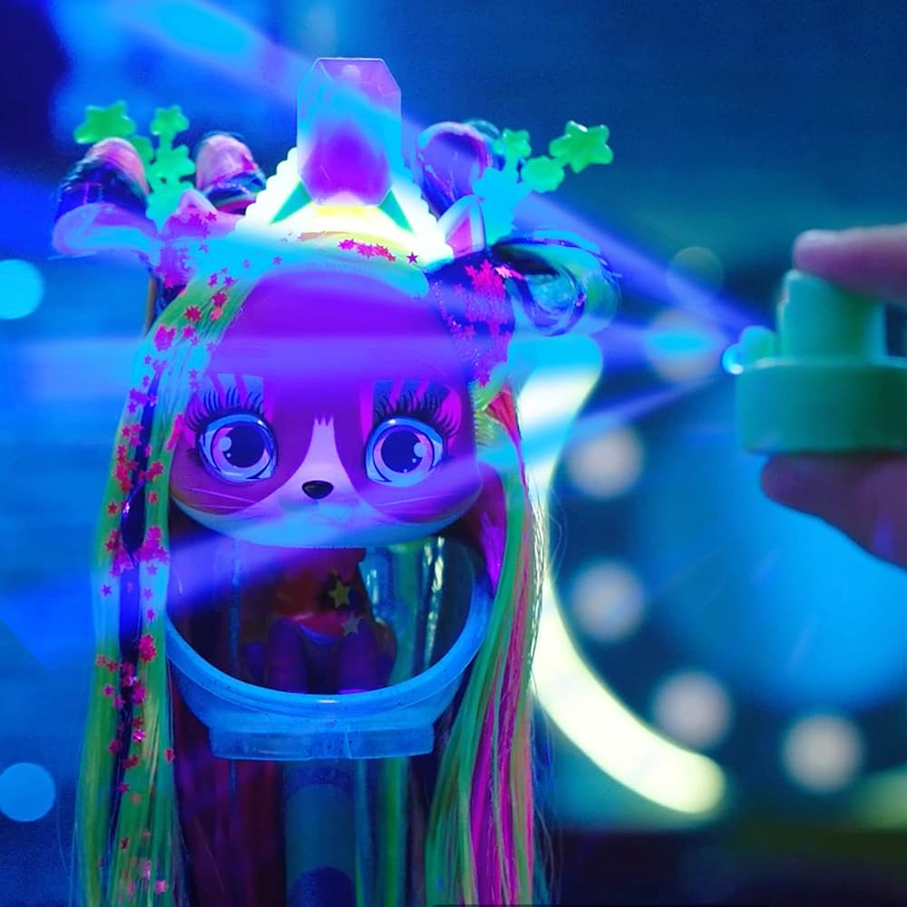 VIP Pets are adding a new pet into the mix! Meet the VIP Pets Cats, they just arrived to Glam City! They're a collection of 3 fashionable neon cats with super long hair! Melisa's rainbow hair and face designs glow in the dark! She comes in a new shampoo pack that looks like a cat and includes a UV flashlight! Press the button on the vessel and you will have a glowy reveal of your character! She includes 10 different surprises to unbox and 8 exclusive accessories to create a neon hairstyle! Her glowy accessories are pink, blue, green to compliment her rainbow hair! The vessel is also a playset with an included salon chair to make styling even easier! Recommended for girls and boys 3+ years to have fun brushing and styling hair. Kids can recreate their favorite scenes from the series or create their own adventures! VIP Pets are great for creative expression and pretend play with siblings and friends!