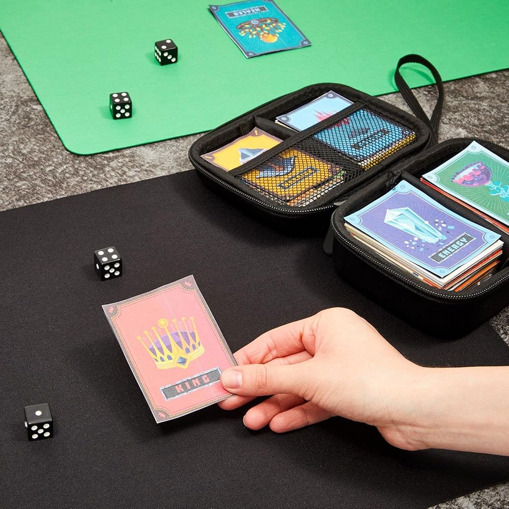 Easily store and protect your valuable decks of cards or games with our card case holder for trading cards. Each black card carrying case features 2 convenient dividers, 2 slots without mesh, 2 slots with mesh, and a wrist string for holding. This playing cards case can hold up to 400 cards in total and is crafted with durable fabric that's made to last. The card holder box measures 6.8 x 5 x 2.5 inches, the mats measure 24 x 24 inches, and the dice each measure 0.6 inches. You'll receive 1 trading card storage box, 2 game mats in black and green, as well as 4 6-sided dice. Use 1 to carry from game site to game site, to carry while traveling, or to keep them in 1 place while you're not using them.