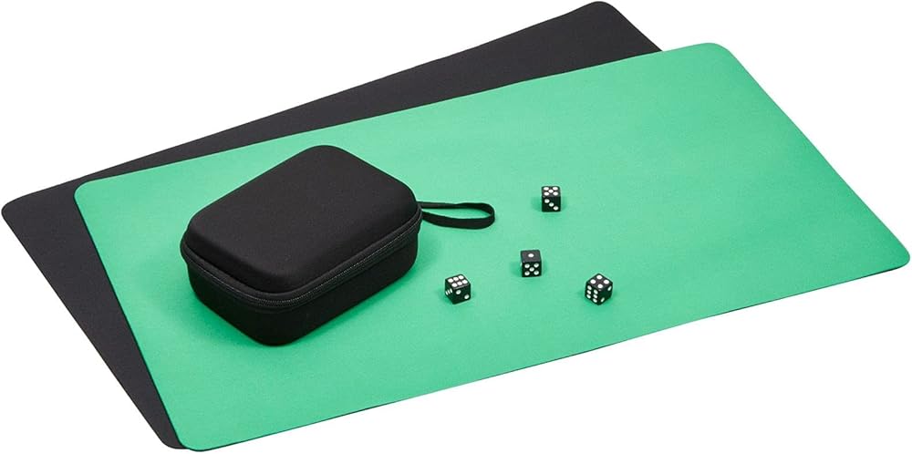 What's Included: You'll receive 1 trading card organizer in black, 2 game mats in black and green, and 4 6-sided dice; 7 pieces in total