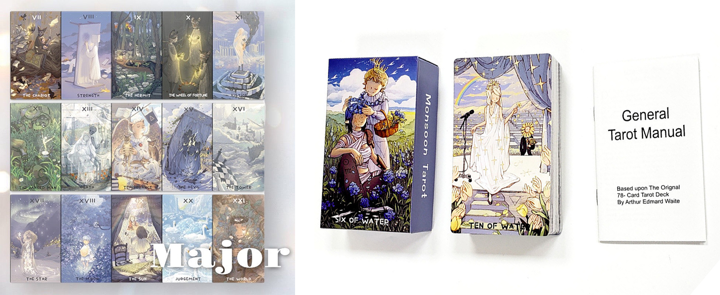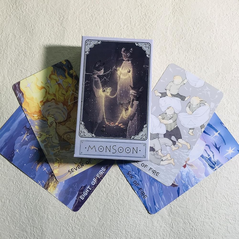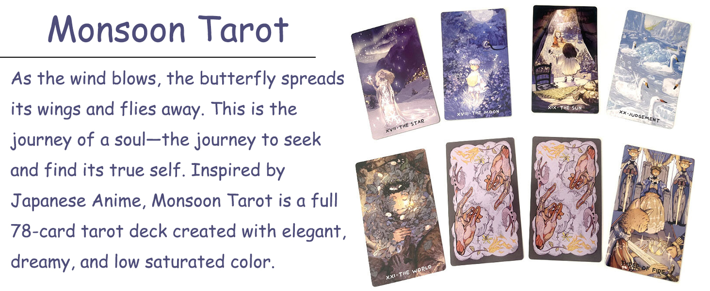 Immerse yourself in the world of compassion, empowerment, and flights of fancy with Monsoon Tarot, an artistic RWS deck designed to guide you on a profound journey of self-discovery. Like a butterfly riding the wind, your soul seeks to find its true essence and purpose, and this captivating tarot deck is here to help you unravel the mysteries of your inner self. Inspired by the captivating allure of Japanese Anime, Monsoon Tarot is a full 78-card deck that embraces elegance, dreaminess, and a palette of low-saturated colors. Each card is a work of art, meticulously crafted with love and care, making it not only a powerful divination tool but also a delightful artistic expression. At the heart of Monsoon Tarot lies the 22 Major Arcana cards, symbolizing significant life events and spiritual lessons. As you explore these cards, you will find a source of guidance and insight that empowers you to make life-altering decisions with clarity and courage. Meanwhile, the 56 Minor Arcana cards, adorned with enchanting Japanese-style illustrations of fairies and other magical creatures, offer a deeper understanding of your emotions, experiences, and daily challenges. Monsoon Tarot is more than just a tool for divination; it is a portal to the realm of whimsical magic and flights of fancy. The deck's imagery and symbolism transcend the mundane, sparking your imagination and inviting you to create your own narrative. Each reading becomes an opportunity to explore your hopes, fears, and dreams, opening doors to newfound inspiration and personal growth.