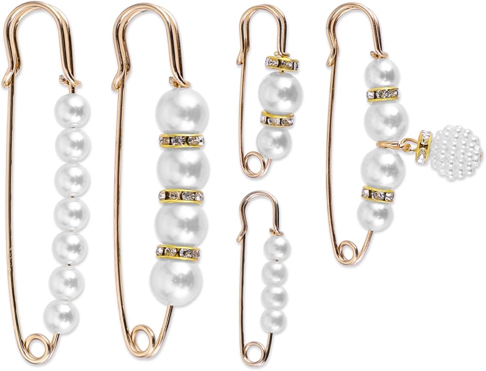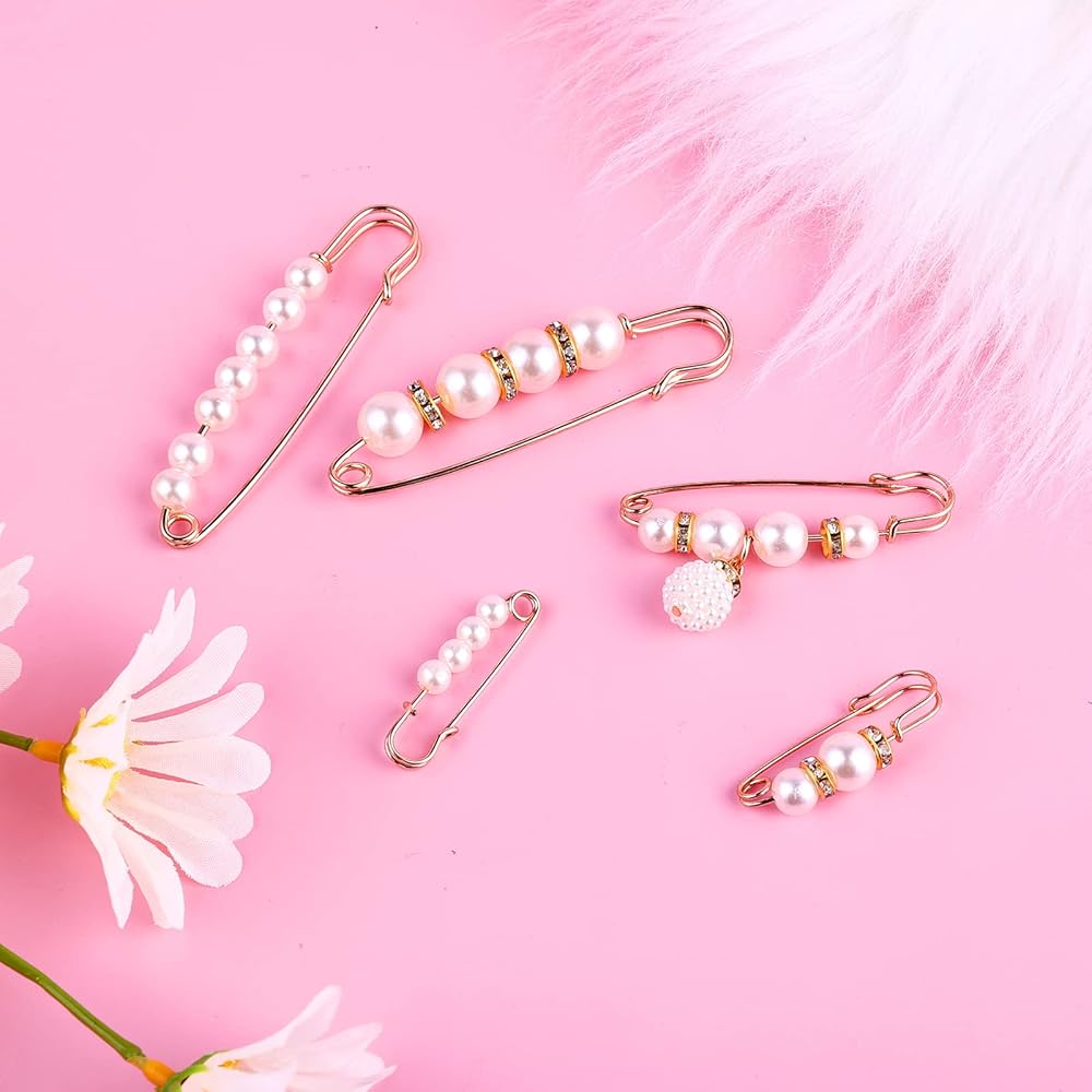 5 Pcs Pearl Brooch Pins Fashion Sweater Shawl Clips Shirts Dresses Waist Pants Safety Pin Clothing Decoration Accessories for Women Girls