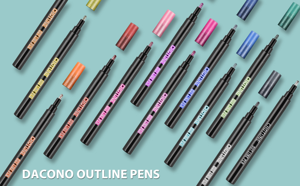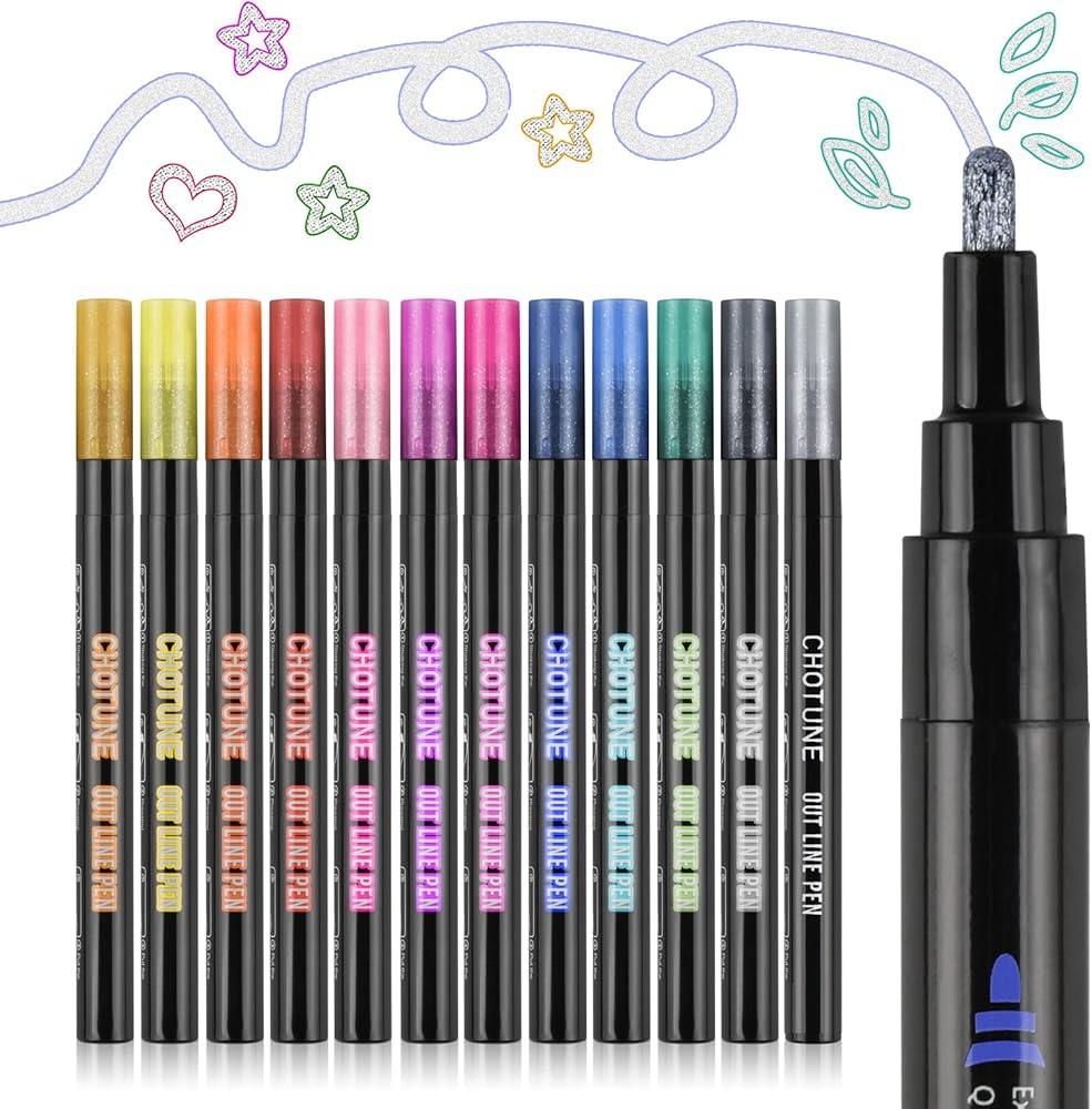 【Various Uses】: The outline marker is perfect for every day drawing and writing use. Outline markers can be used for greeting cards, poster making, painting, journaling, arts and crafts, DIY photo albums, and highlighting. Double line outline Marking works on almost any surface at the same time, such as rock, metal, ceramic, wood, glass, plastic, stone, etc. Shiny metallic silver with outlines in a variety of different colors allows you to create unique designs and fonts in no time.