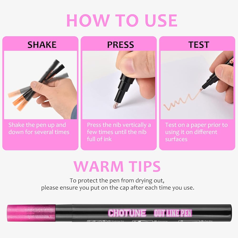 【Easy to Use】: Point the shimmer outline marker tip down and shake the holder before use. Press the nib on the paper for a while until the ink flows to the nib, and you can start using it, which is very convenient. For best results, replace the marker cap immediately after use.(It is recommended to write on thicker paper, otherwise there will be permeation)