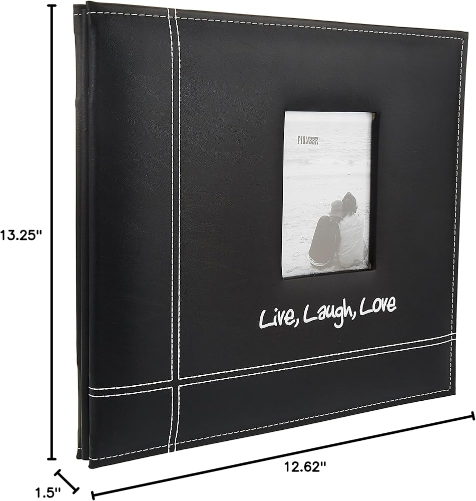 Black faux leather covering with bright white top stitching and embroidery make this album simple and sophisticated. Front cover features a 4-7/8x3-3/8in photo window. Includes ten top-loading acid and lignin free sheet protectors with heavy white paper inserts. Album measures 12-5/8x13-1/4x1-1/2in. Made in China.