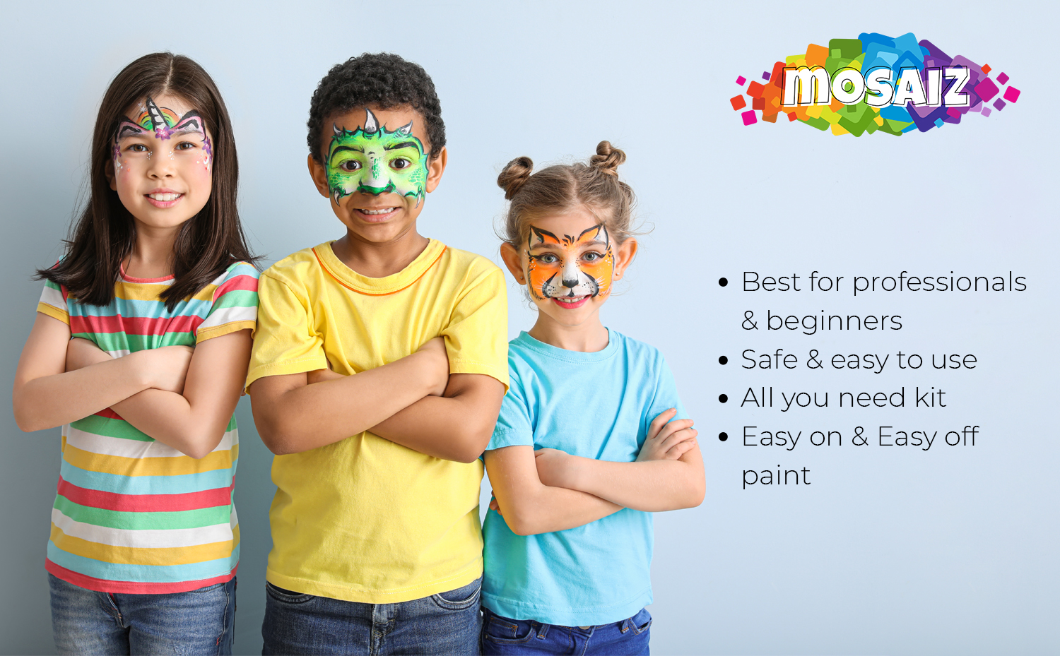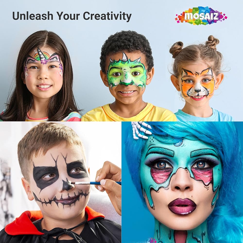 VERSATILE USE - Looking for a fun family activity, group activities idea, Halloween makeup kit, Clown makeup, unique gifts idea, Purim gift for girls and boys? Mosaiz face paint pallete has it: Dress up game, pretend play, school carnivals, festivals, Christmas party, children birthday party, cosplay, parade, prenatal belly painting, horror movies figures makeup, theatre stage makeup, role play, superhero, Halloween zombie makeup, vampire, animal makeup, witch costume or Christmas gift.