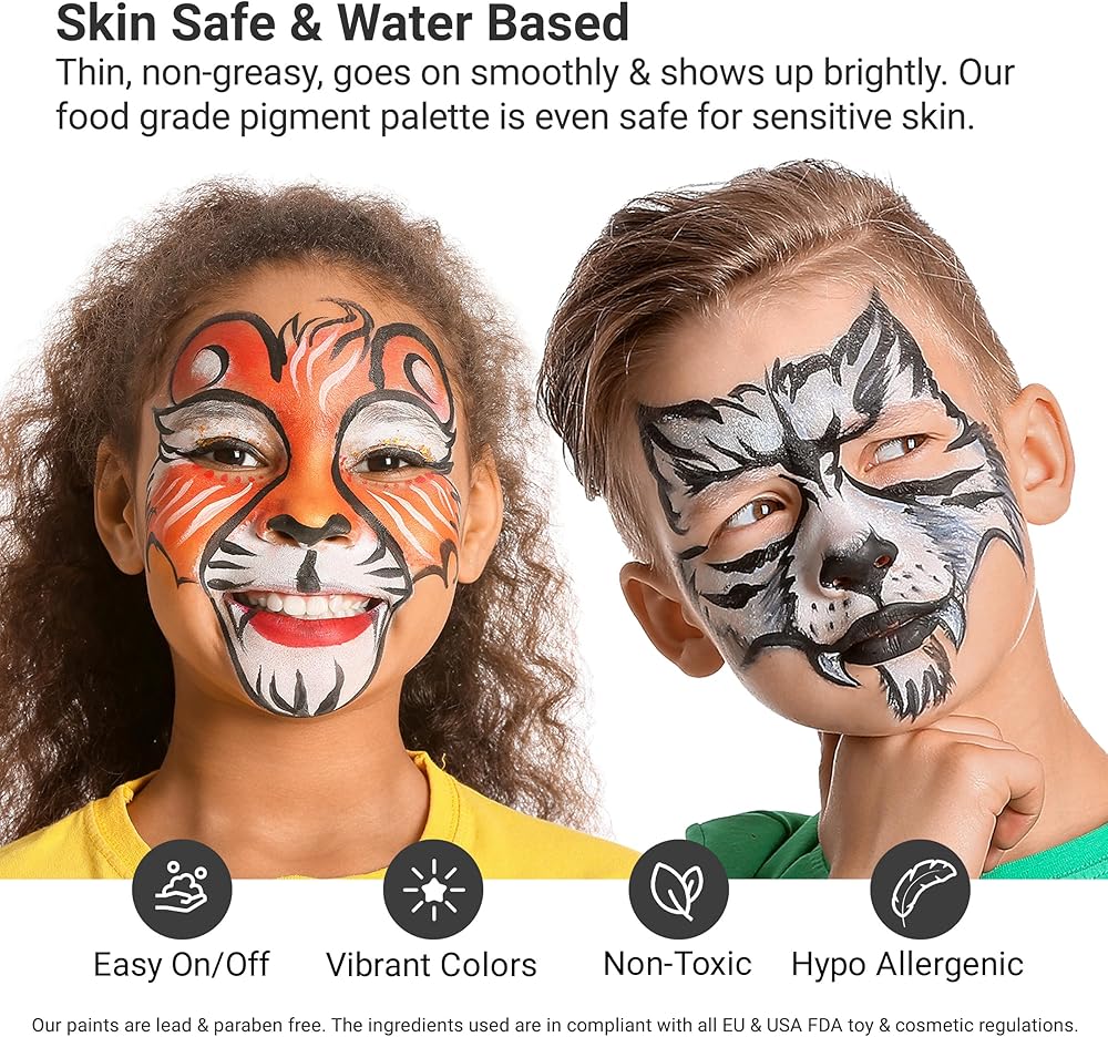 SAFE AND EASY USE - Our facepainting palette is great for sensitive skin - the colors are skin friendly, food grade pigmented and contain skin-safe ingredients. The makeup colors dry fast, they are easy to wash and remove with mild soap and warm water. The Face Painting Set is safe for kids, No Paraben included, dermatologist tested and also confirms to ASTMD-4236.