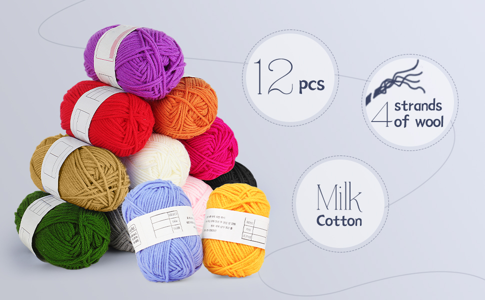 [You'll Be Like a Kid in a Sweet Shop When You Open This Crochet Kit and Start Exploring] This is a very nice crochet set in a navy bag. There are 12 balls of yarn that contain about 50 yards each in the colors yellow, pink, blue and red etc.The yarn is quite soft.There's a set of 12 ergonomic crochet hooks with the straight, rubber-style handles ranging in size from 2.0 to 8.0 mm, There is also an entire bag of notions including scissors, stitch markers, a measuring tape, metal sewing needle