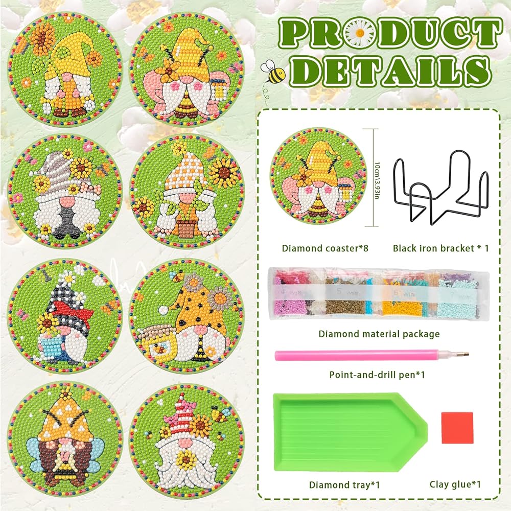 Package includes: you will receive 8 gnomes diamond painting coasters in different designs, 1 black iron holder, 1 diamond pen, 1 clay, 1 diamond tray, enough diamonds for your creation.