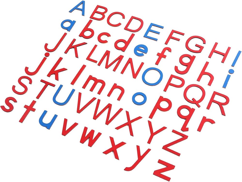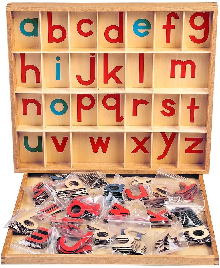 The Moveable Alphabet consists of one wooden box with 26 compartments. Each letter has a uppercase letter, containing 5 of each consonant in red and 10 of each vowel in blue, 26 block letters are printed on the bottom of the wooden box.