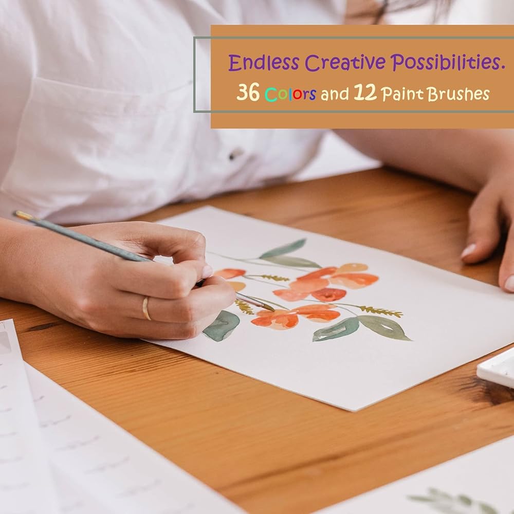 Premium Non-Toxic Watercolor Paint Set for Kids and Adults - Vibrant Water Color Paint Set with 36 Colors and 12 Paint Brushes - Watercolor Palette Art Supplies for Students and Professional Artists