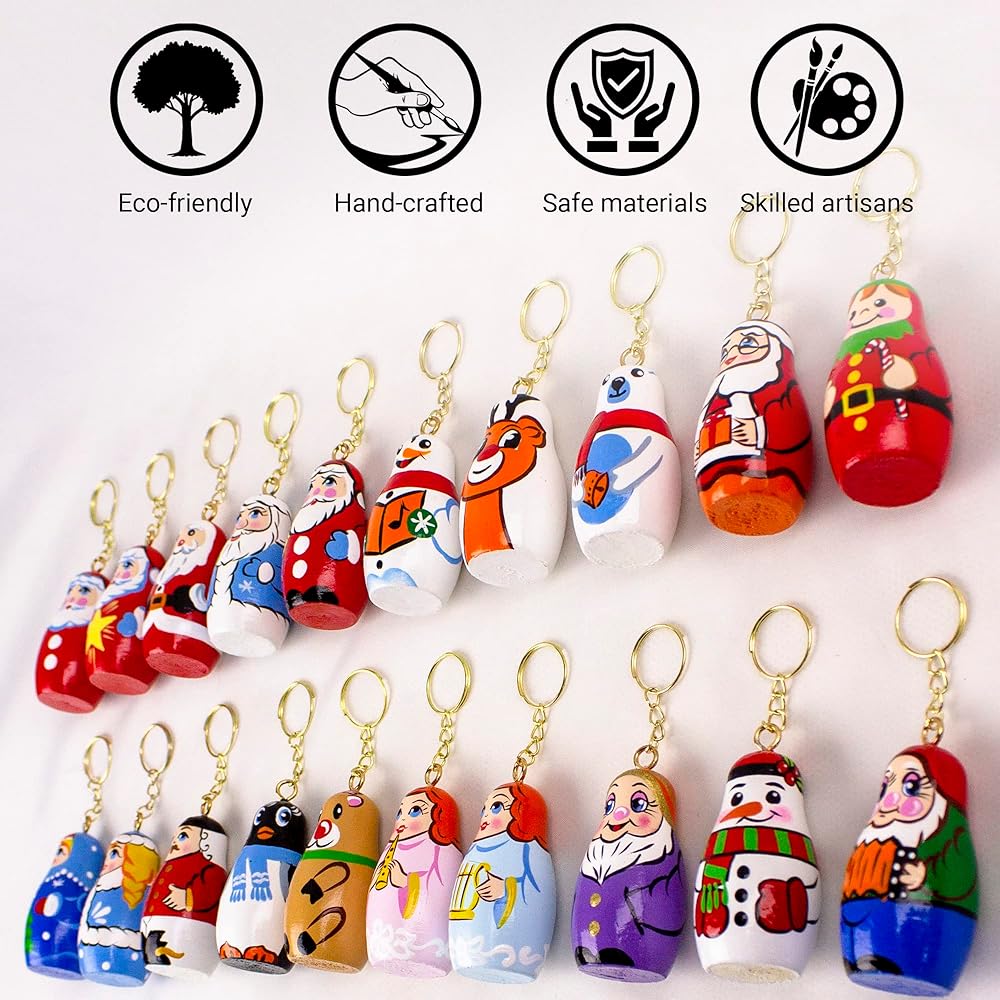 - PERFECT DIMENSIONS: wooden key chain set include 20 dolls, height of each doll is 2'', width 0.8''