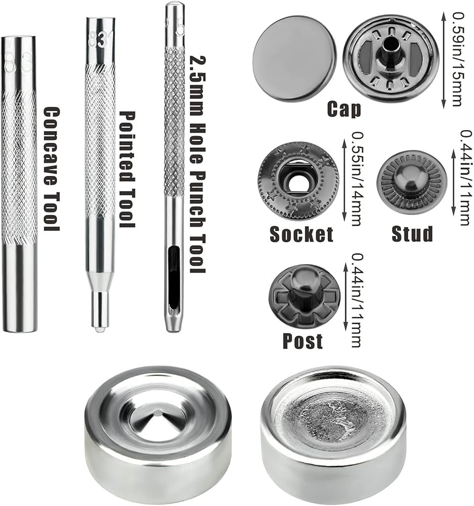 【Product Size】15mm diameter and 6mm height of cap, one set of snap button includes cap and socket, stud and post.