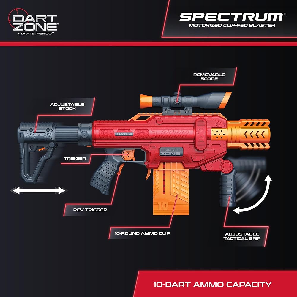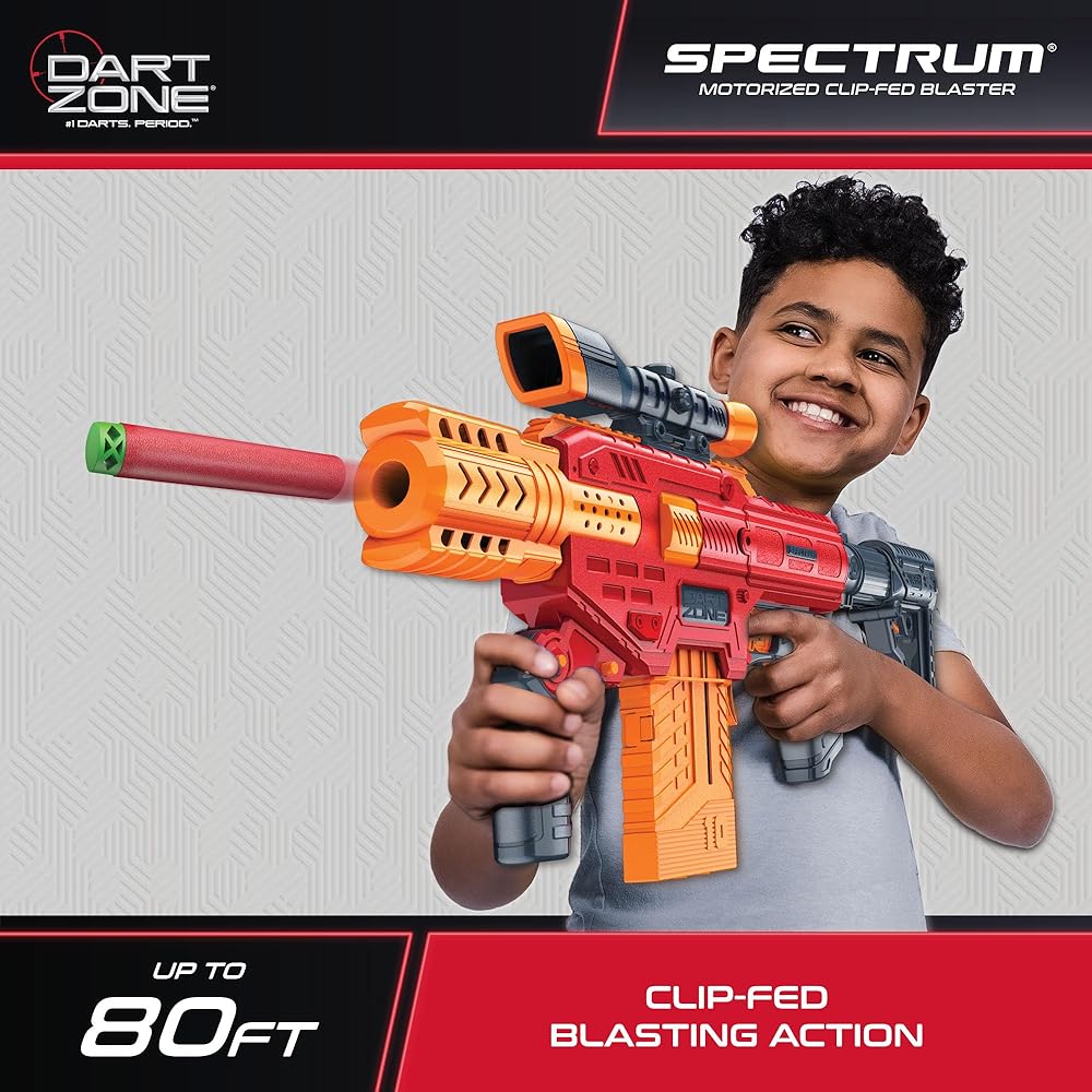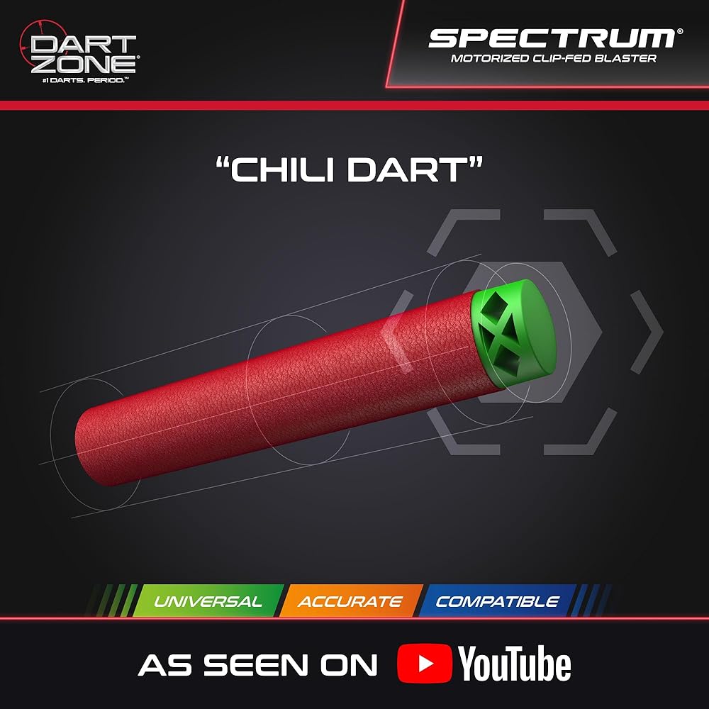 THE ULTIMATE DART BLASTER VALUE SET – Snag this set and get 1 DART ZONE Spectrum Motorized Clip-fed toy machine gun blaster, 5 x 10-round cartridges and 50 Dart Zone Red Diamond “Chili” Darts.