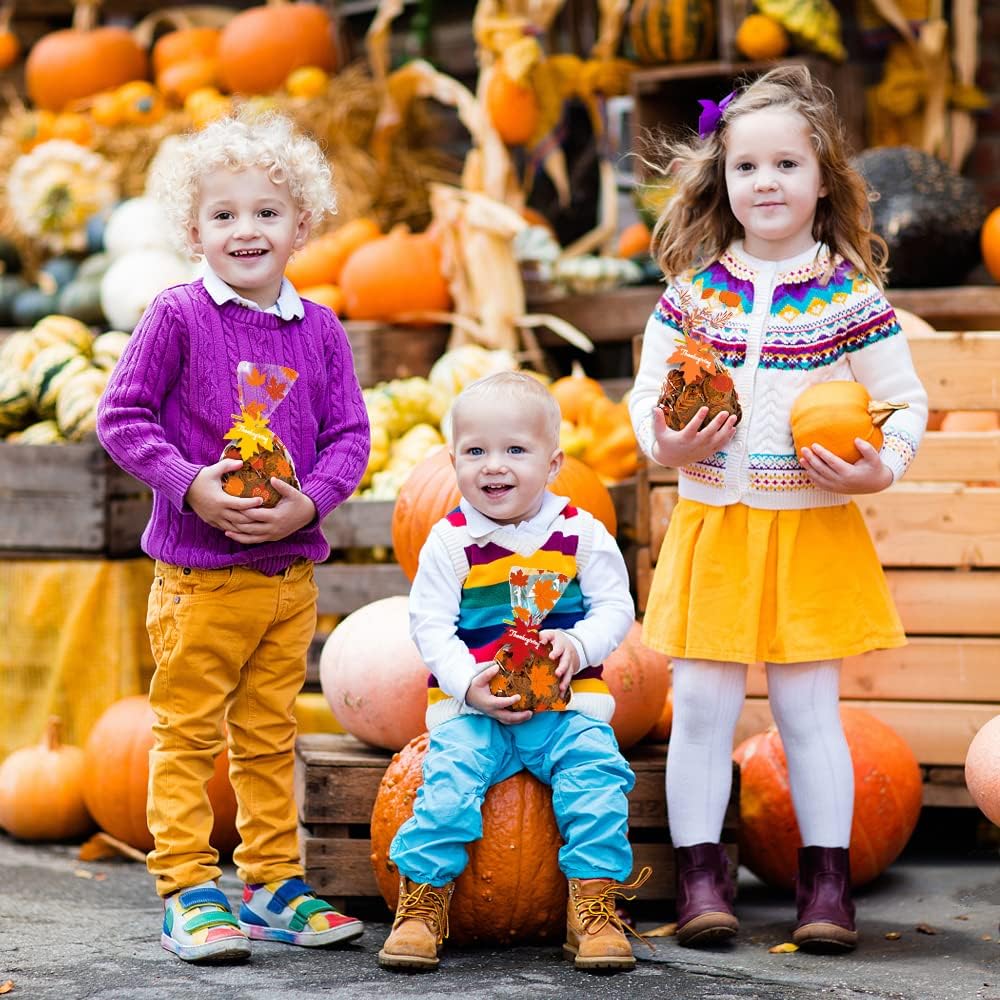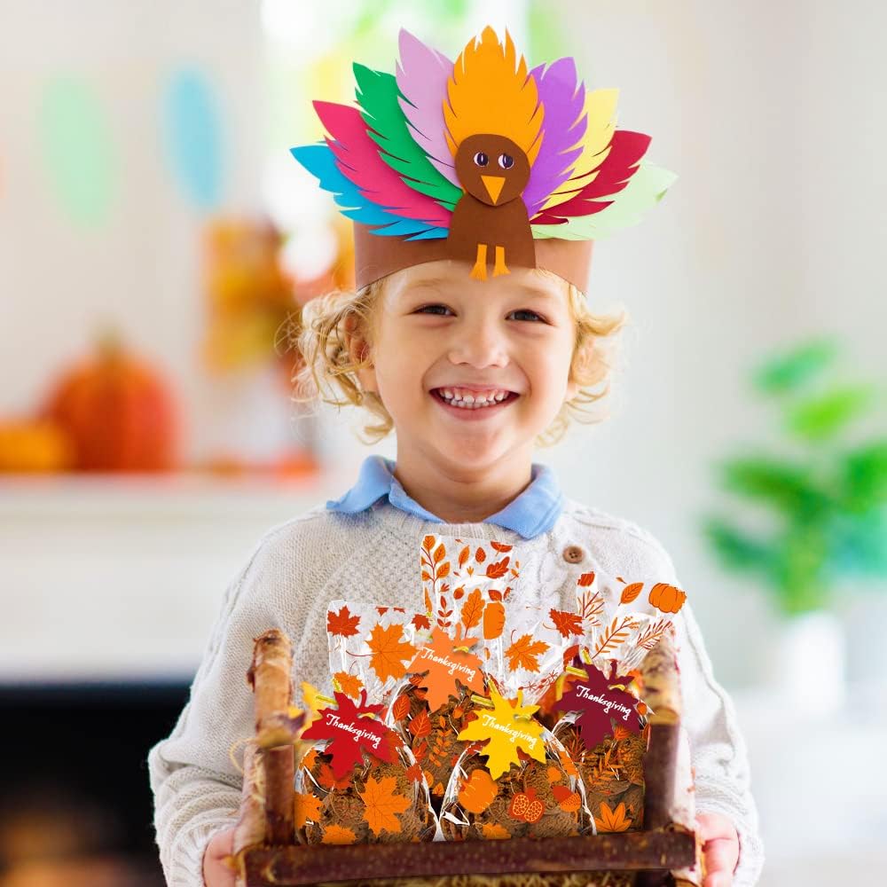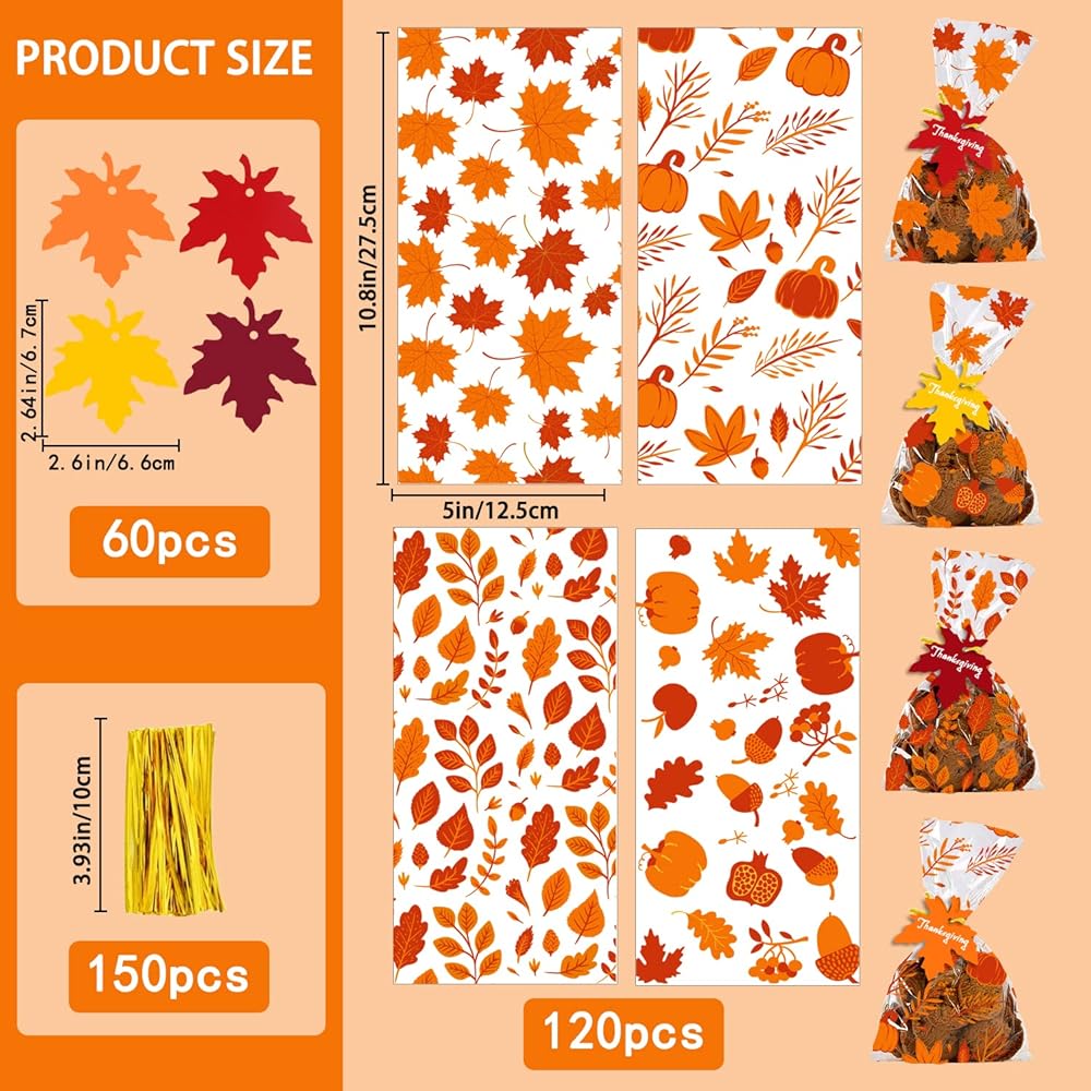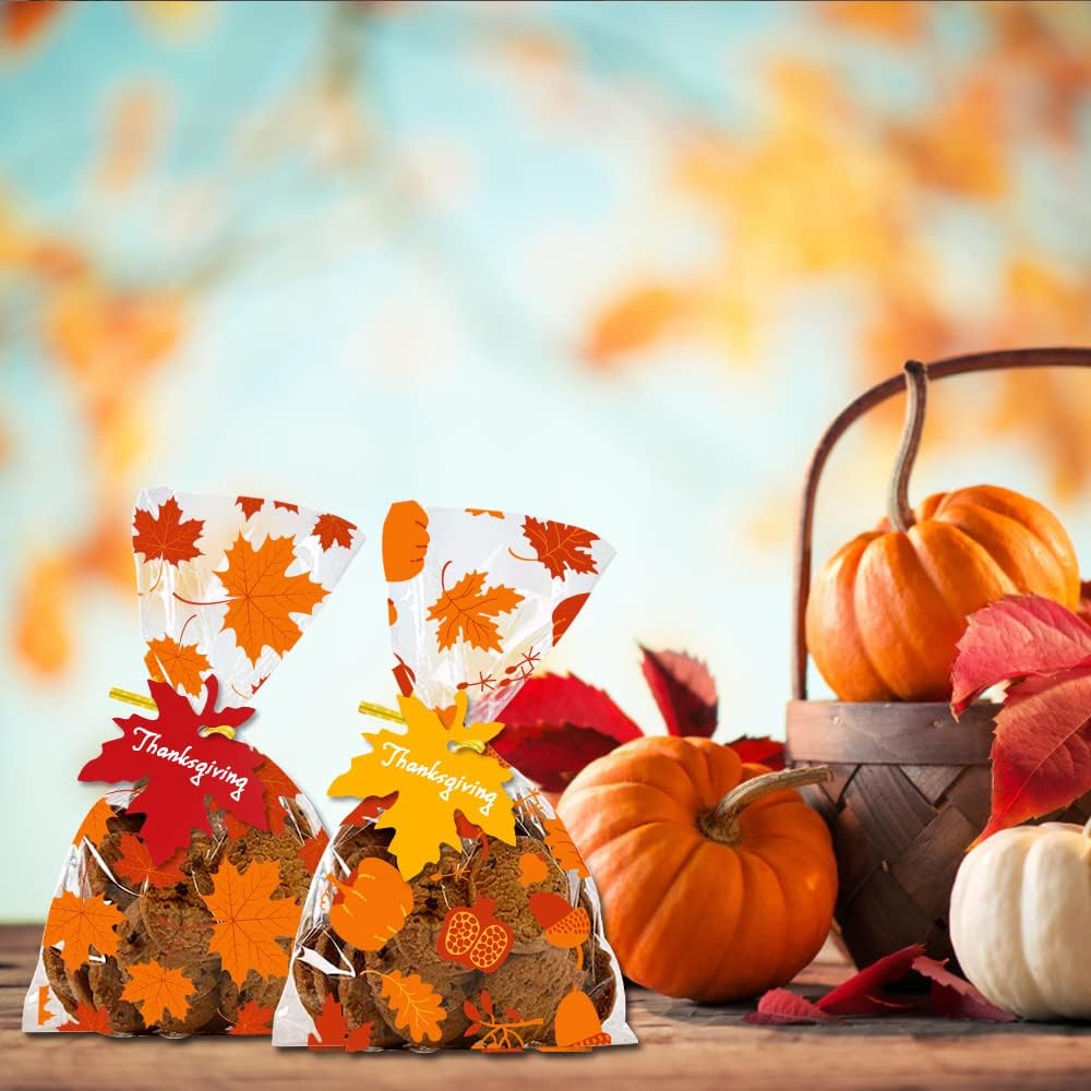 THANKSGIVING CELLOPHANE BAGS: You will get 120PCS Thanksgiving Treat Bags,60 Pieces Maple Leaves card,150Pieces gold Twist Ties, enough amount for you to complete a Thanksgiving theme party food supplies and decorations.