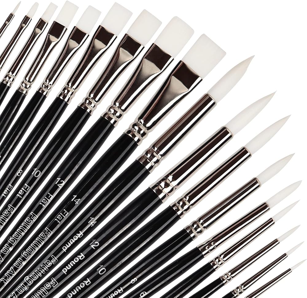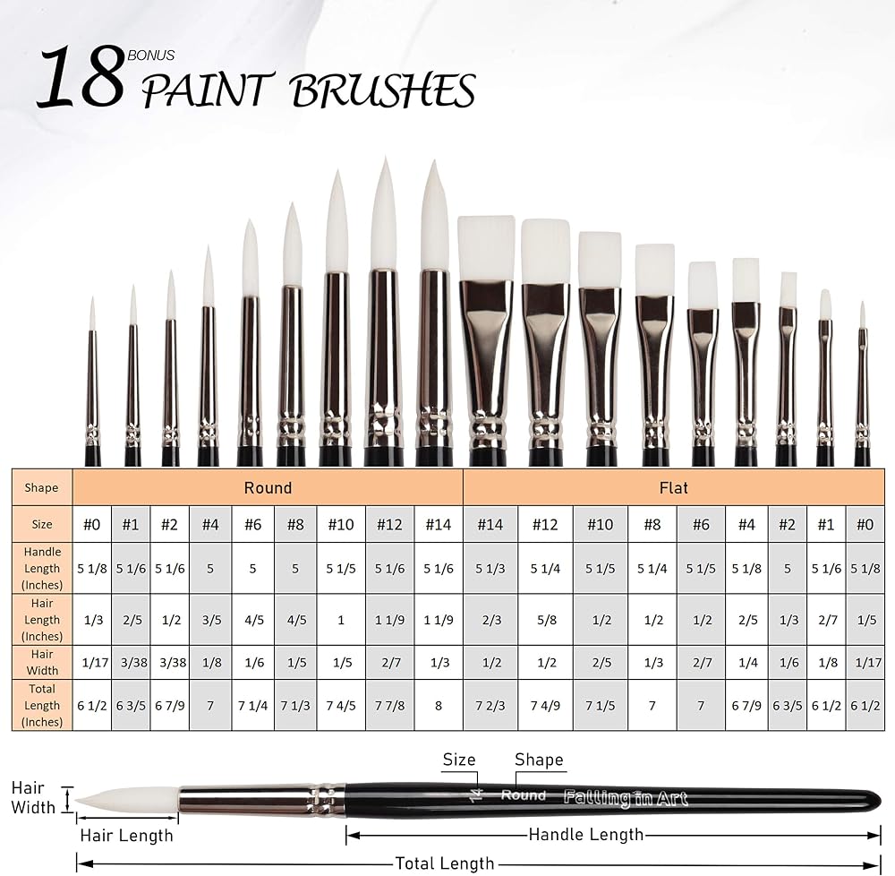 Falling in Art Flat and Round Tips White Sable Paint Brush Set - 18PCS Artist Face Paint Brushes, Short Handled Nylon Brushes Set for Watercolor, Oil, Acrylic, Craft, Gouache