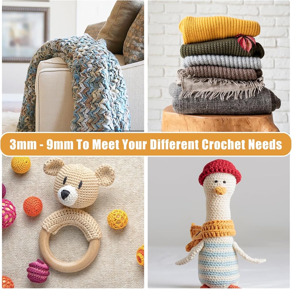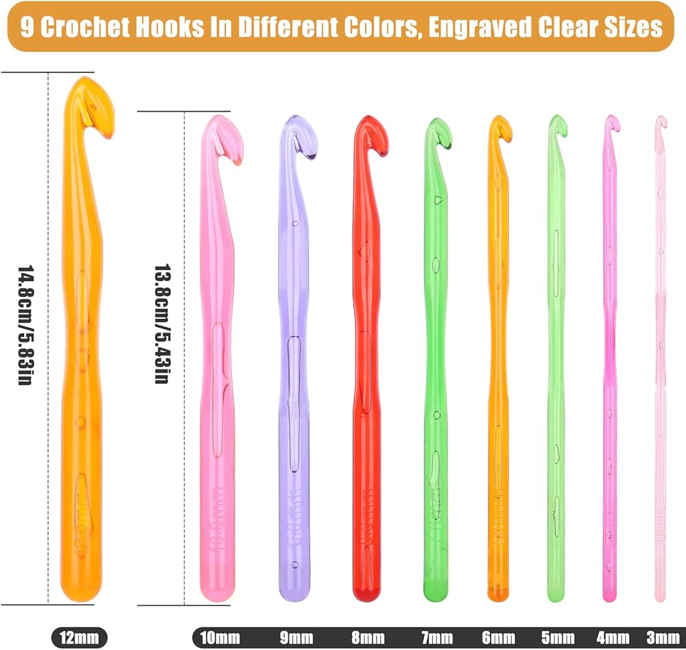 Plastic crochet hooks include 9 different size (3mm, 4mm, 5mm, 6mm, 7mm, 8mm, 9mm, 10mm, 12mm ) to meet your different crochet needs.