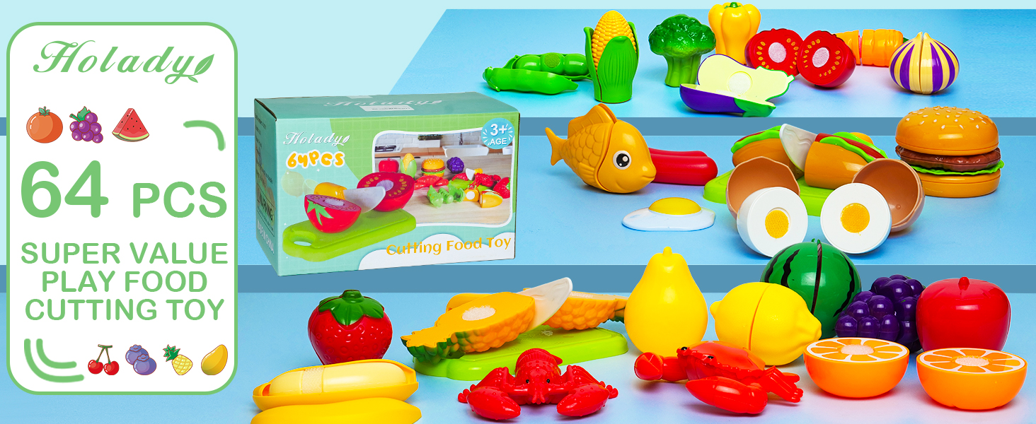 مجموعة طعام للعب من هوليدي 64 قطعة لمطبخ الأطفال، قطع بلاستيكية للأطعمة المزيفة/الفاكهة/الخضروات مع صندوق تخزين، لعبة تعليمية لأعياد ميلاد البنات والأولاد