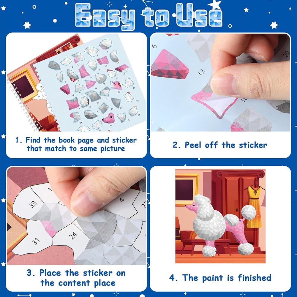 【Easy to Use】Uncover the ideal match of book pages and stickers for every image in our sticker paint books. Easily peel off the stickers and carefully place them on the designated numbers within the book to unveil a masterpiece of your own making.