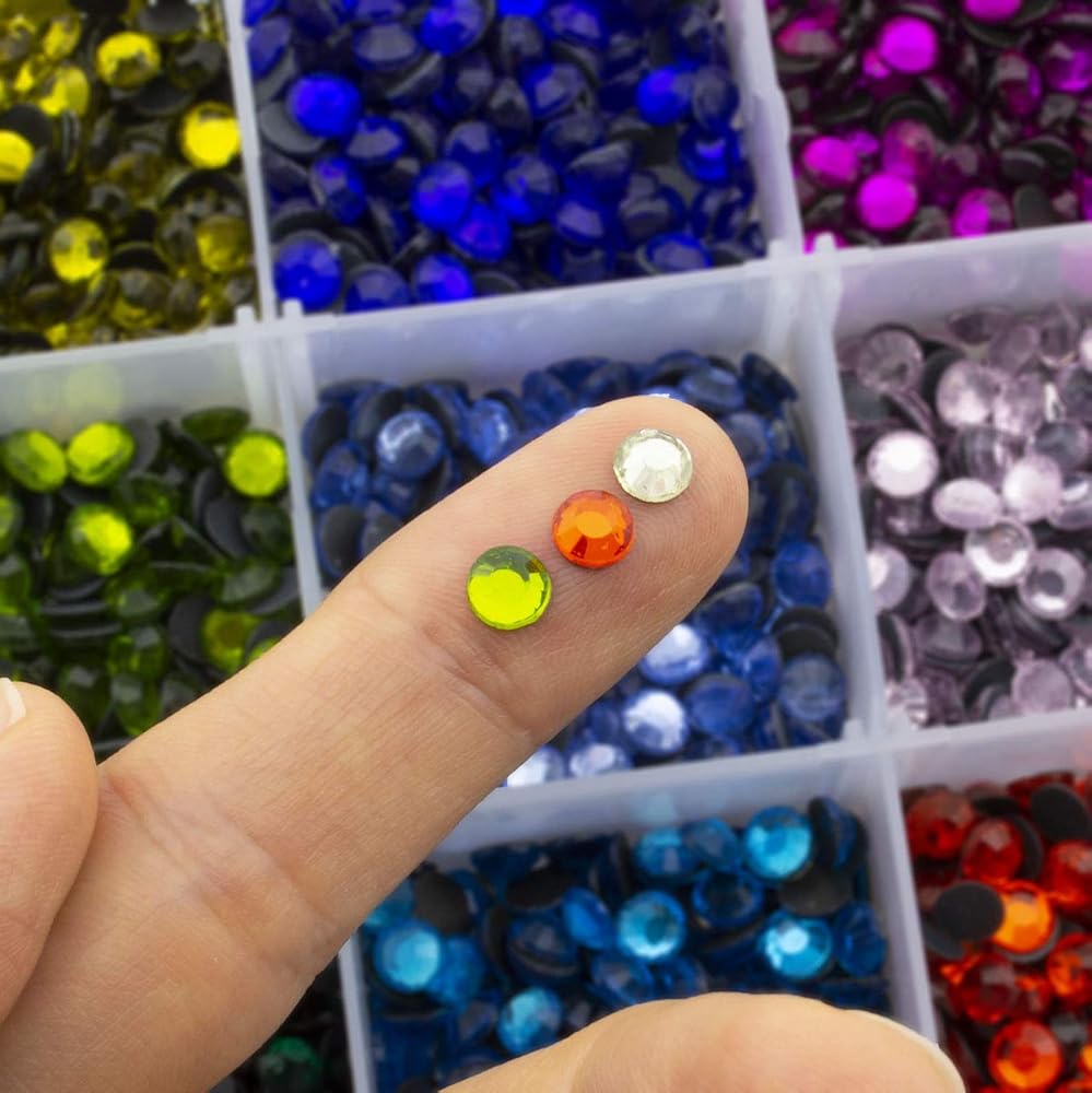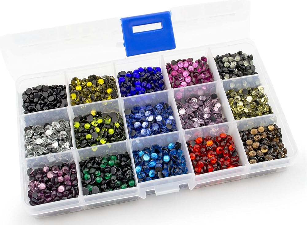 3000pcs of ss20 5mm rhinestones in 15 colors come in a storage box. The colors contained in this set are Light Amethyst, Citrine, Capri Blue, Hyacinth, Jet Nut, Clear, Peridot, Aquamarine, Baby Pink, Light Yellow, Black, Emerald, Cobalt Blue, Pink and Black Diamond.