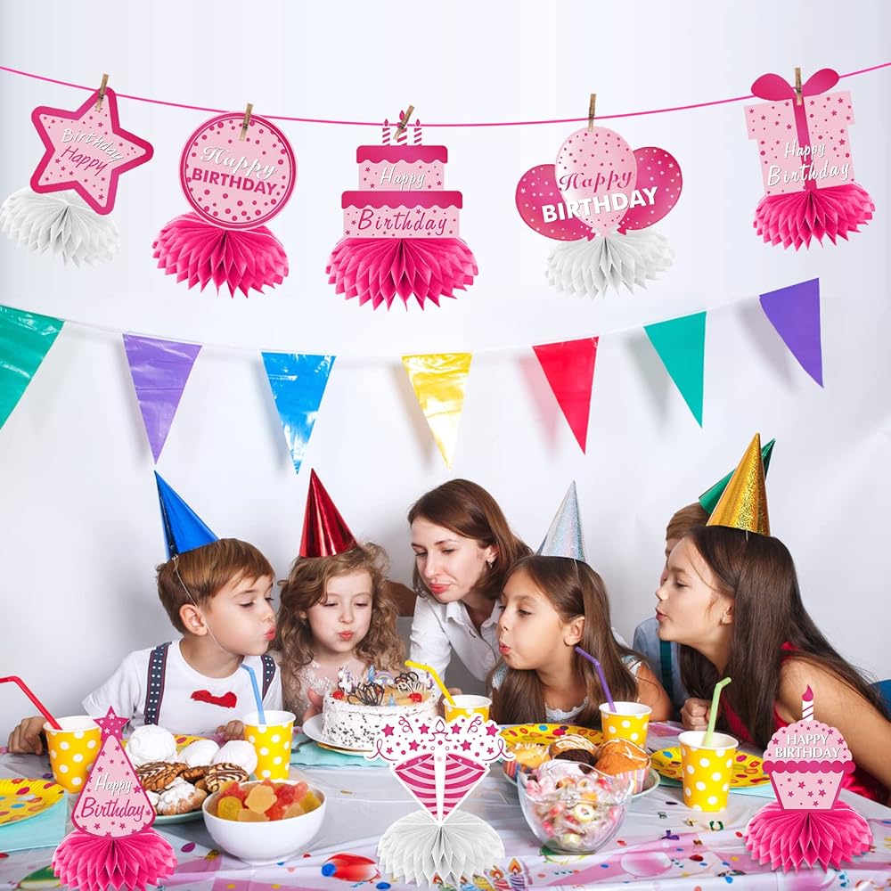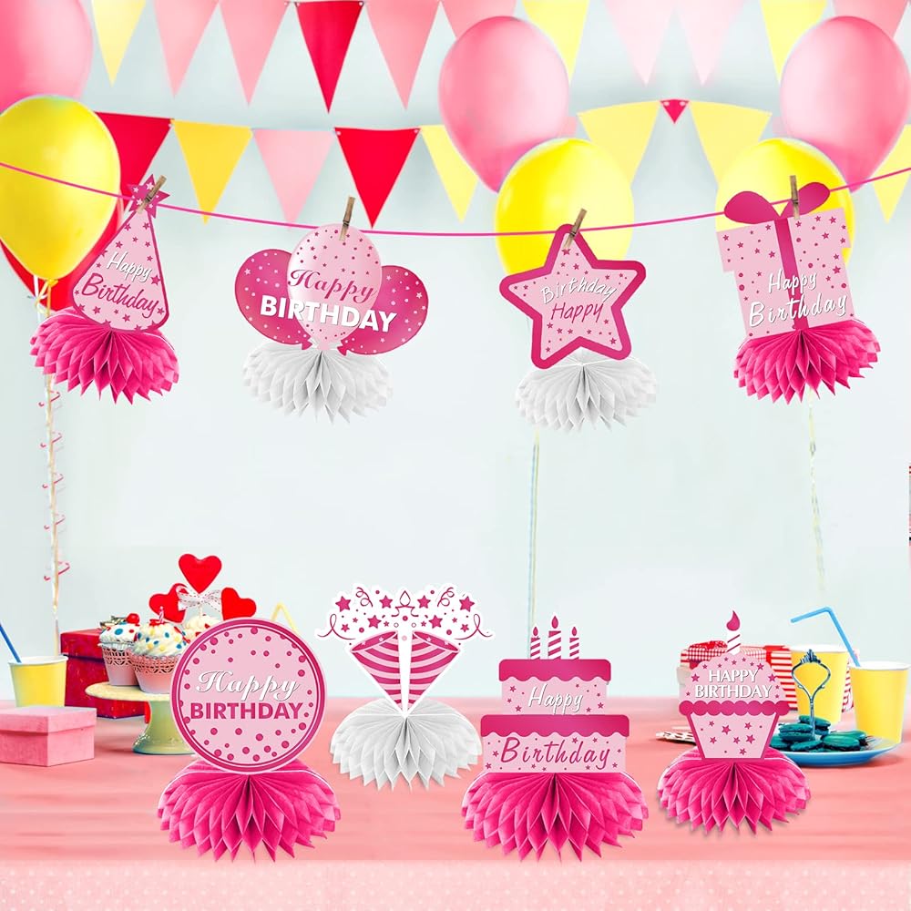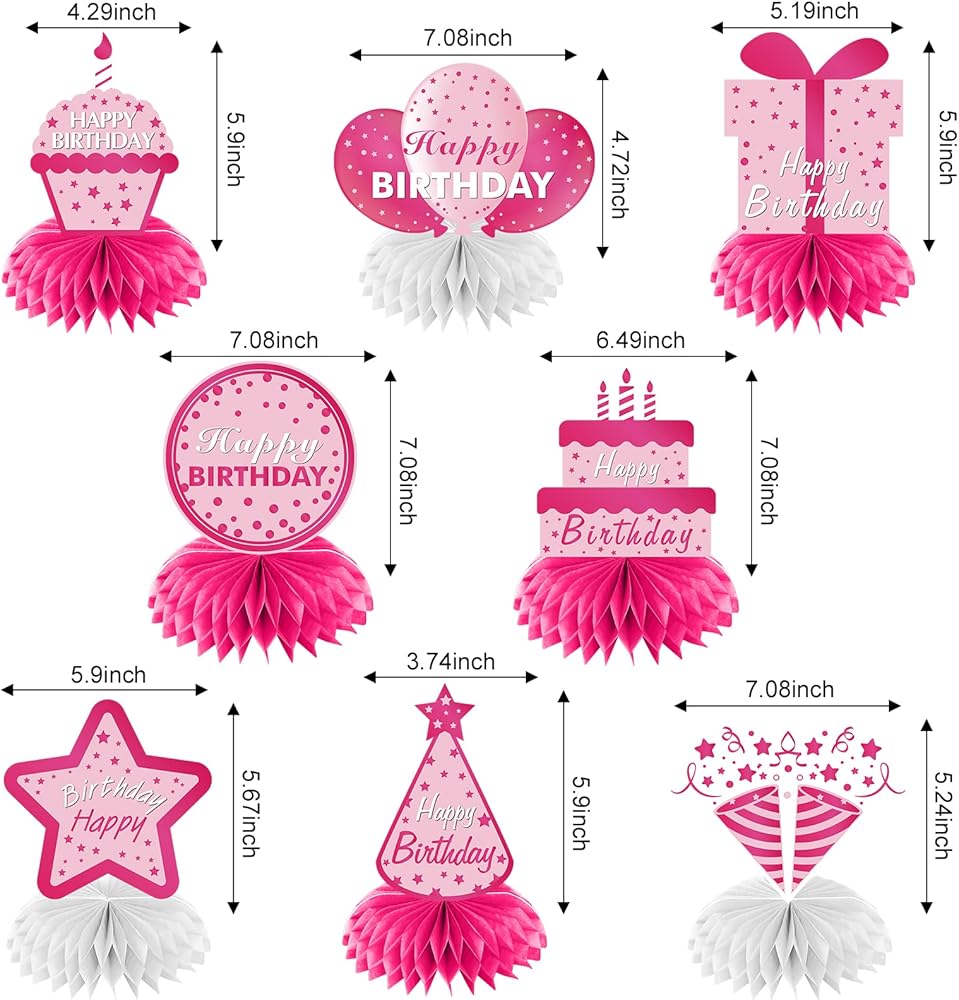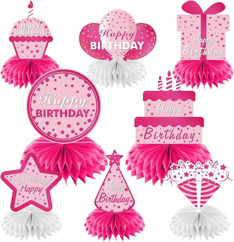 8Pcs Hot Pink Happy Birthday Decorations Honeycomb Centerpieces.
