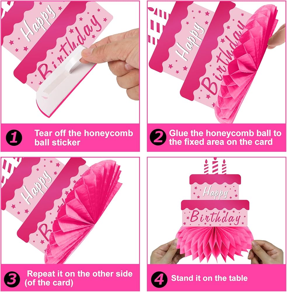[You will get] - 8pcs hot pink birthday table honeycomb centerpieces, consisting of 8 x patterned cards, 5 pieces of red-pink honeycomb and 3 x white honeycomb, enough to decorate your birthday party.