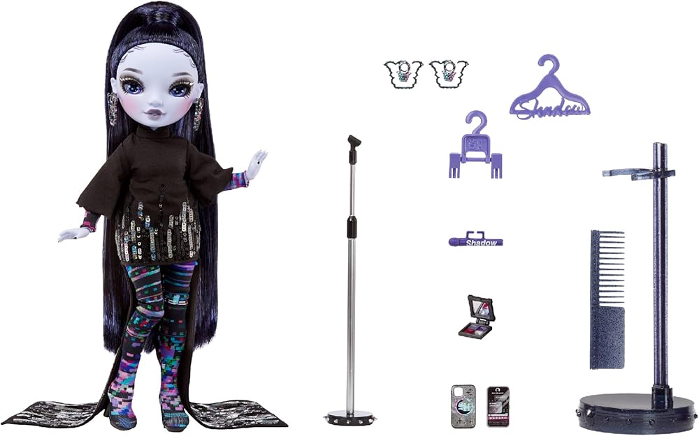 CREATIVITY: At Shadow High, the students are creative, and express their passions through their focus. Reina “Glitch” is a Fashion Designer. She comes with fun accessories for hosting Rainbow Vision music contest or touching up the models before the runway: Mic + stand, adorable cellphone + case, and make-up pallet. This playset will give kids endless joy and imaginative storytelling fun.