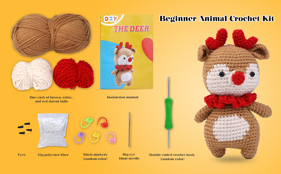 Complete Crochet Kit: Our Crochet kit comes with 3 colors of yarn, 1 x double-ended crochet hook (random color), 5 x stitch markers(random color), 1 x instructions, 1 x big eye blunt needle, 4 x eyes, and 25g polyester fiber. This complete crochet kit is for beginners.
