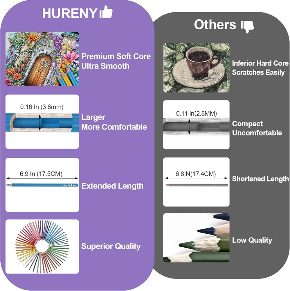 Built for Durability: Hureny's colored pencils are designed with robust, break-resistant cores, ensuring uninterrupted creativity. Suitable as color pencils for kids or adults, they sharpen easily, meeting the needs of both aspiring artists and professionals. Our color pencils set offers the same quality found in professional colored pencils, making them a versatile addition to any artist's toolkit. Perfect for coloring in an adult coloring book or creating intricate designs.